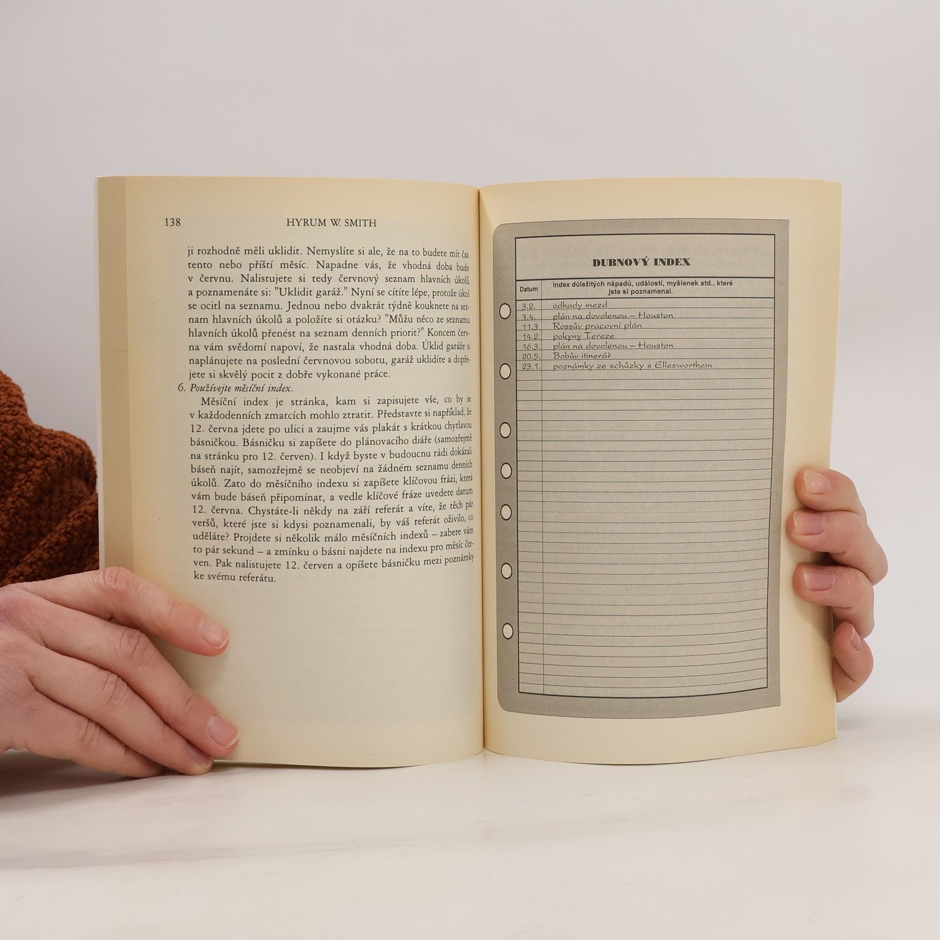 Osvědčené strategie pro zvýšení vaší produktivity a dosažení vnitřního míru. Hyrum Smith byl u zrodu diářů Franklin (dnes FranklinCovey) a napsal pro vás velmi čtivou a praktickou knihu věnovanou plánování času. Najdete zde přesný postup a rady: kde začít s plánováním času, principy, ze kterých by mělo vaše plánování vycházet, vaše hodnoty, vaše cíle, jaký diář je dobré používat, jak správně diář používat, jak si plánovat schůzky, kam si psát poznámky a mnoho dalších užitečných informací.