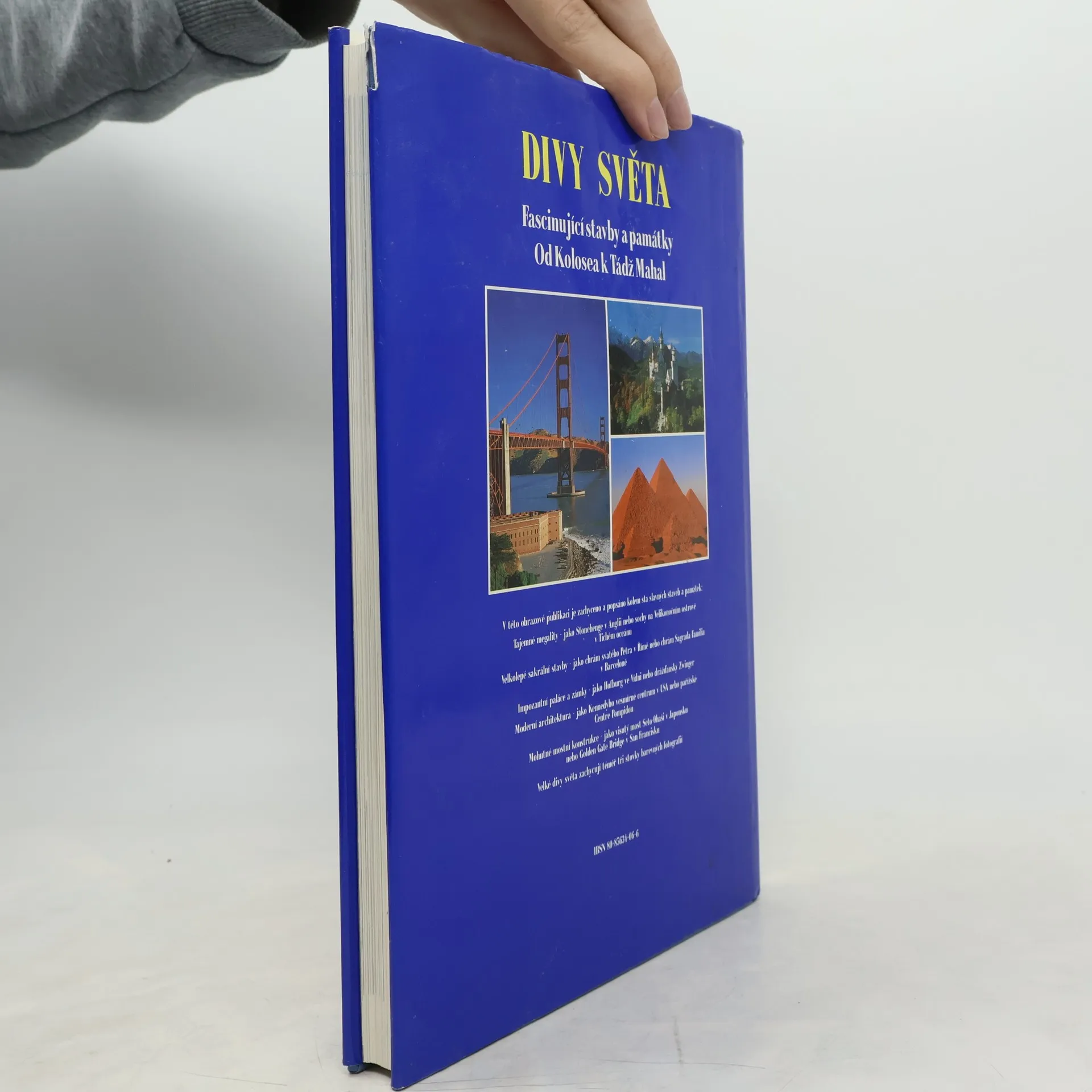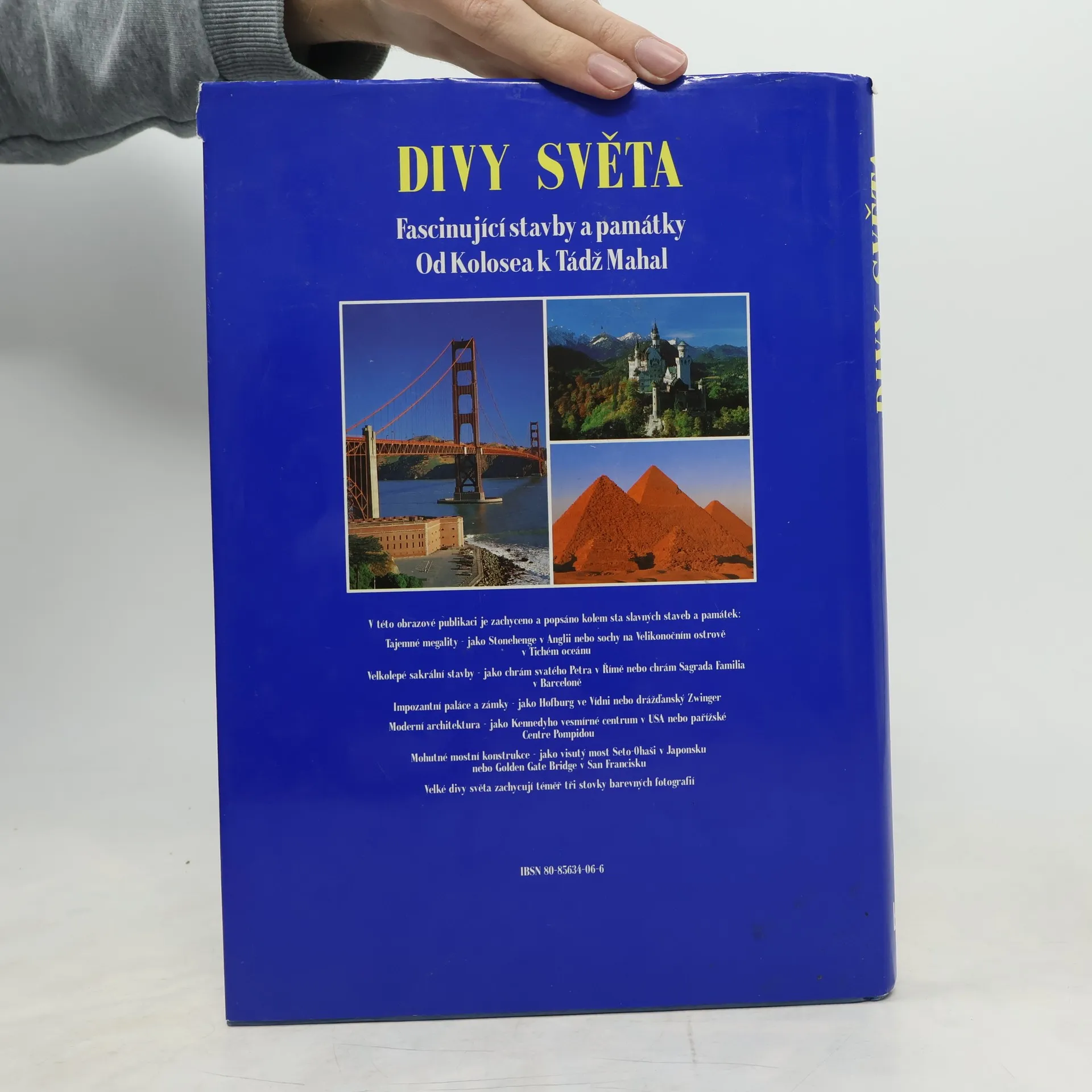 Tato obrazová publikace předvádí na stovku pozoruhodných a facsinujících staveb v rozmezí deseti tisíc let. Spektrum je široké, chrámy kostely, paláce a zámky, ale i ulice plné vody, přehrady, železnice a samozřejmě i věže a mrakodrapy našeho století. Publikace je rozdělena podle světadílů, stati udávají jednotlivé tematické okruhy jako například kostely skouží fundované historické informaci a usnadňuje přehled. Každé stabě je věnována jedna dvojstrana. Fascinující obrazy - kolem tři set dokonalých barevných fotografií - předvádějí velké divy tohoto světa.