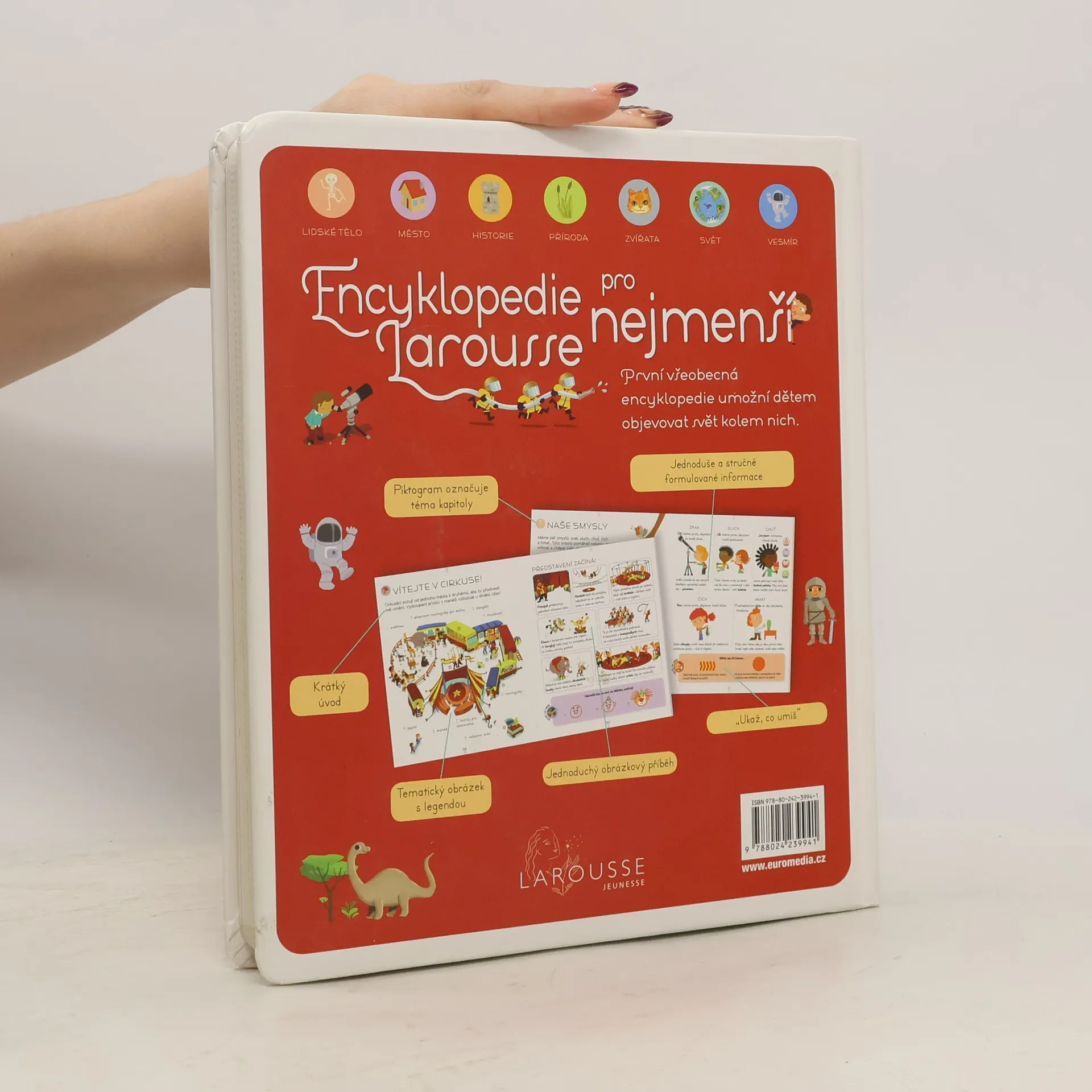 Všeobecná encyklopedie, která umožní malým dětem objevovat svět, který je obklopuje. Tematicky je rozdělena do sedmi tematických okruhů: lidské tělo, město, historie, příroda, zvířata, svět a vesmír, a každé z nich představuje srozumitelným a přitažlivým způsobem, pomocí krátkých informativních textů, přehledných piktogramů a četných názorných obrázků. Tuto knihu budete číst s dětmi znovu a znovu.
