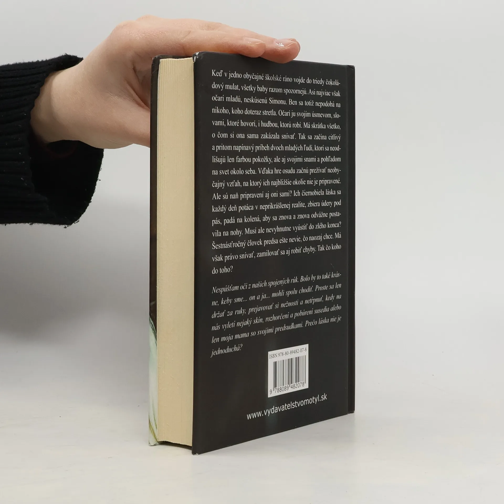 Keď v jedno obyčajné školské ráno vojde do triedy čokoládový mulat, všetky baby razom spozornejú. Asi najviac však očarí mladú, neskúsenú Simonu. Ben sa totiž nepodobá na nikoho, koho doteraz stretla. Očarí ju svojím úsmevom, slovami, ktoré hovorí, i hudbou, ktorú robí. Má skrátka všetko, o čom si ona sama zakázala snívať. Tak sa začína citlivý a pritom napínavý príbeh dvoch mladých ľudí, ktorí sa neodlišujú len farbou pokožky, ale aj svojimi snami a pohľadom na svet okolo seba. Vďaka hre osudu začnú prežívať neobyčajný vzťah, na ktorý ich najbližšie okolie nie je pripravené. Ale sú naň pripravení aj oni sami? Ich čiernobiela láska sa každý deň potáca v neprikrášlenej realite, zbiera údery pod pás, padá na kolená, aby sa znova a znova odvážne postavila na nohy. Musí ale nevyhnutne vyústiť do zlého konca? Šestnásťročný človek predsa ešte nevie, čo naozaj chce. Má však právo snívať, zamilovať sa aj robiť chyby. Tak čo koho do toho?