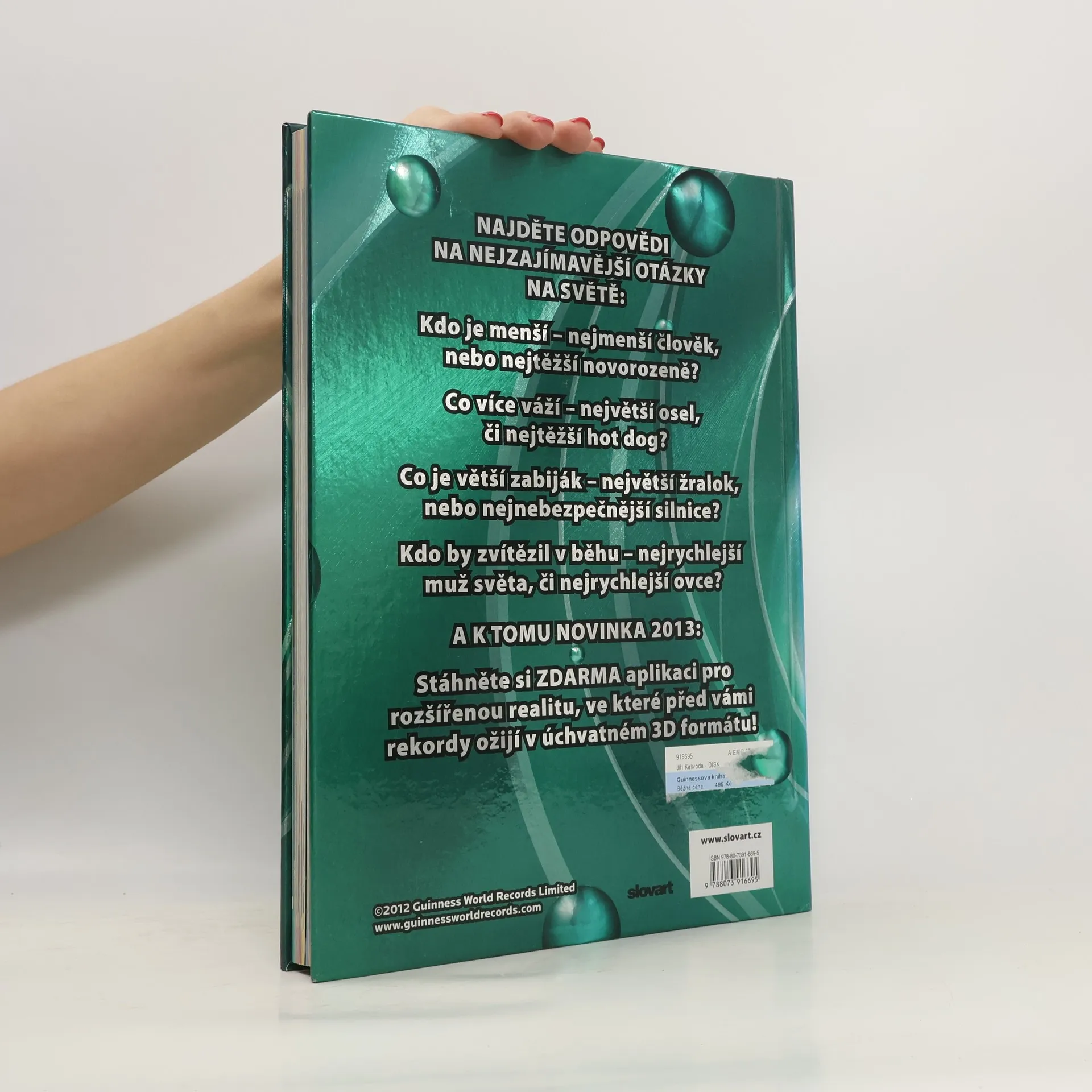 V letošním vydání přináší i odpovědi na otázky: Kdo je menší - nejmenší člověk, nebo nejtěžší novorozeně? Co více váží - největší osel, či nejtěžší hot dog? Co je větší zabiják - největší žralok, nebo nejnebezpečnější silnice? Kdo by zvítězil v běhu - nejrychlejší muž světa, či nejrychlejší ovce? Guinnessova kniha rekordů pro rok 2013 obsahuje zcela nové a nikdy nepublikované rekordy, které tvoří asi 2/3 celého obsahu. Zbývající část se věnuje nepřekonatelným rekordům, tedy rekordům, které vznikly již velmi dávno, ale nikdy nebyly a velmi pravděpodobně ani nebudou překonány. Zdarma si navíc můžete stáhnout aplikaci pro rozšířenou realitu, ve které před vámi rekordy ožijí v úchvatném 3D formátu!