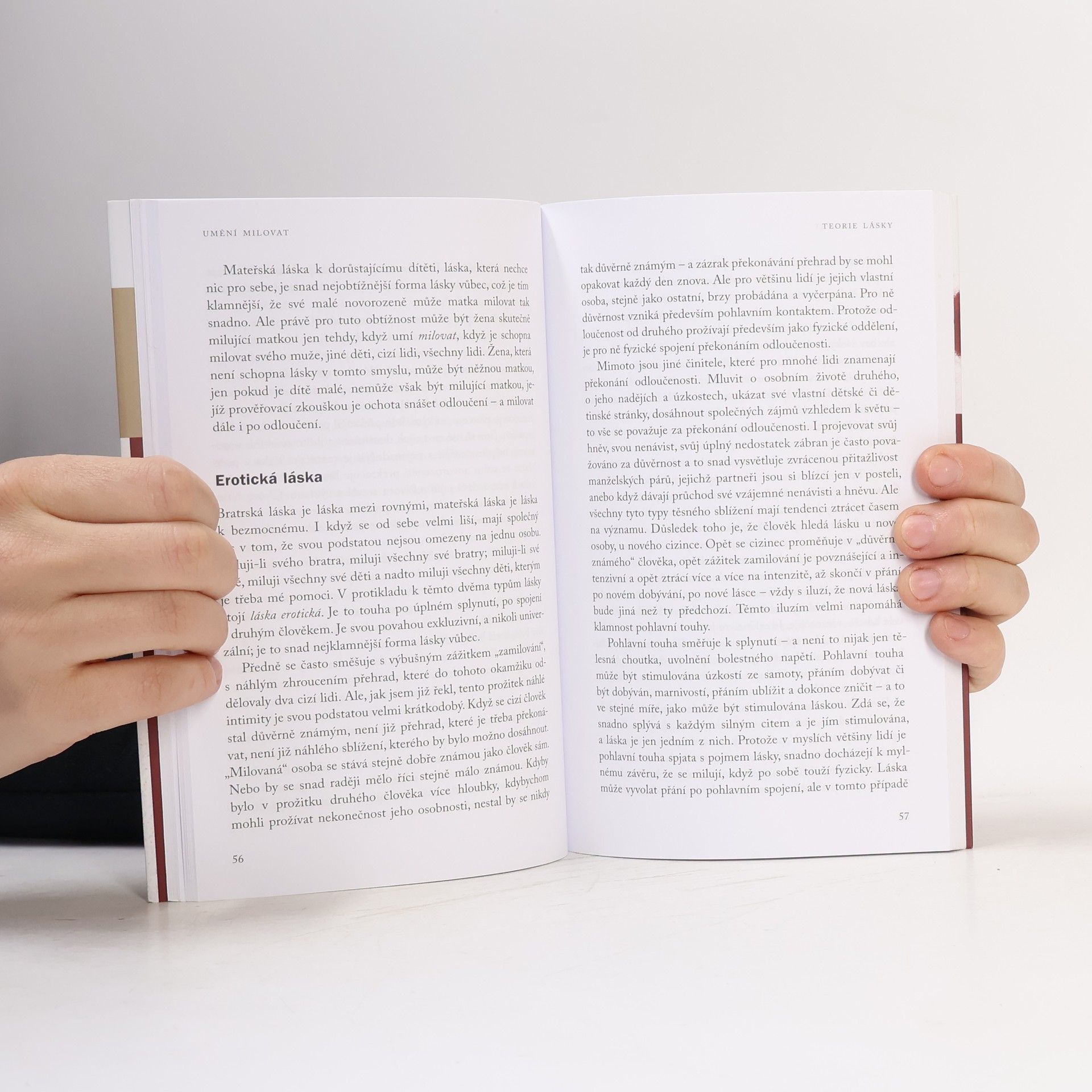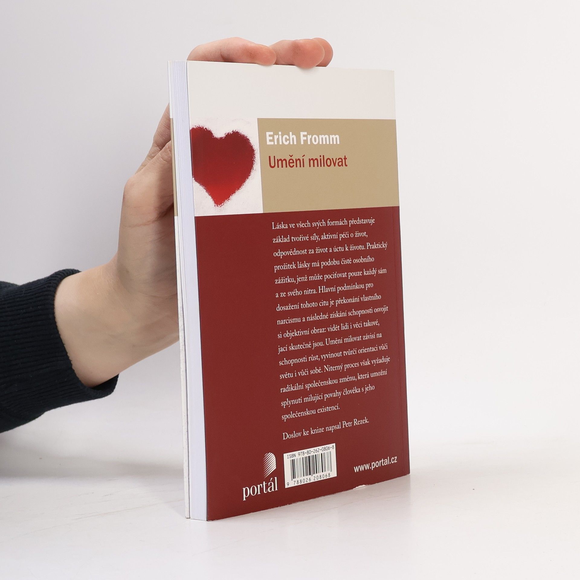 Láska ve všech svých formách představuje základ tvořivé síly, aktivní péči o život, odpovědnost za život a úctu k životu. Praktický prožitek lásky má podobu čistě osobního zážitku, jenž může pociťovat pouze každý sám a ze svého nitra. Hlavní podmínkou pro dosažení tohoto citu je překonání vlastního narcisismu a následné získání schopnosti osvojit si objektivní obraz: vidět lidi i věci takové, jací skutečně jsou. Umění milovat závisí na schopnosti růst, vyvinout tvůrčí orientaci vůči světu i vůči sobě. Niterný proces však vyžaduje radikální společenskou změnu, která umožní splynutí milující povahy člověka s jeho společenskou existencí. Erich Fromm (1900–1980) byl původem německý sociální psycholog, sociolog, humanistický filozof a demokratický socialista, spojený s tzv. frankfurtskou školou a s kulturní psychoanalýzou. Mezi jeho nejznámější knihy patří Strach ze svobody (Portál, 2014), Umění milovat, Anatomie lidské destruktivity, Mít, nebo být.