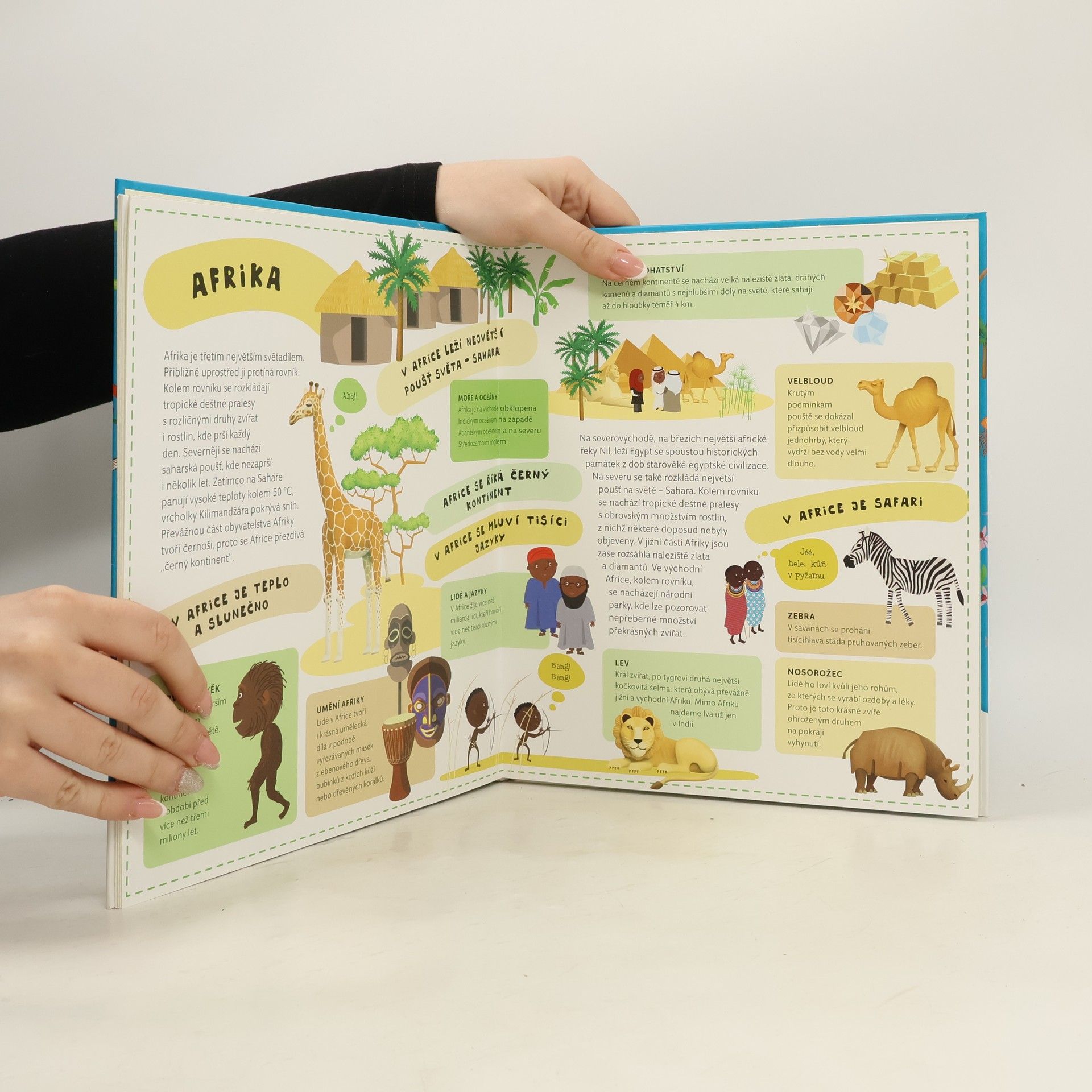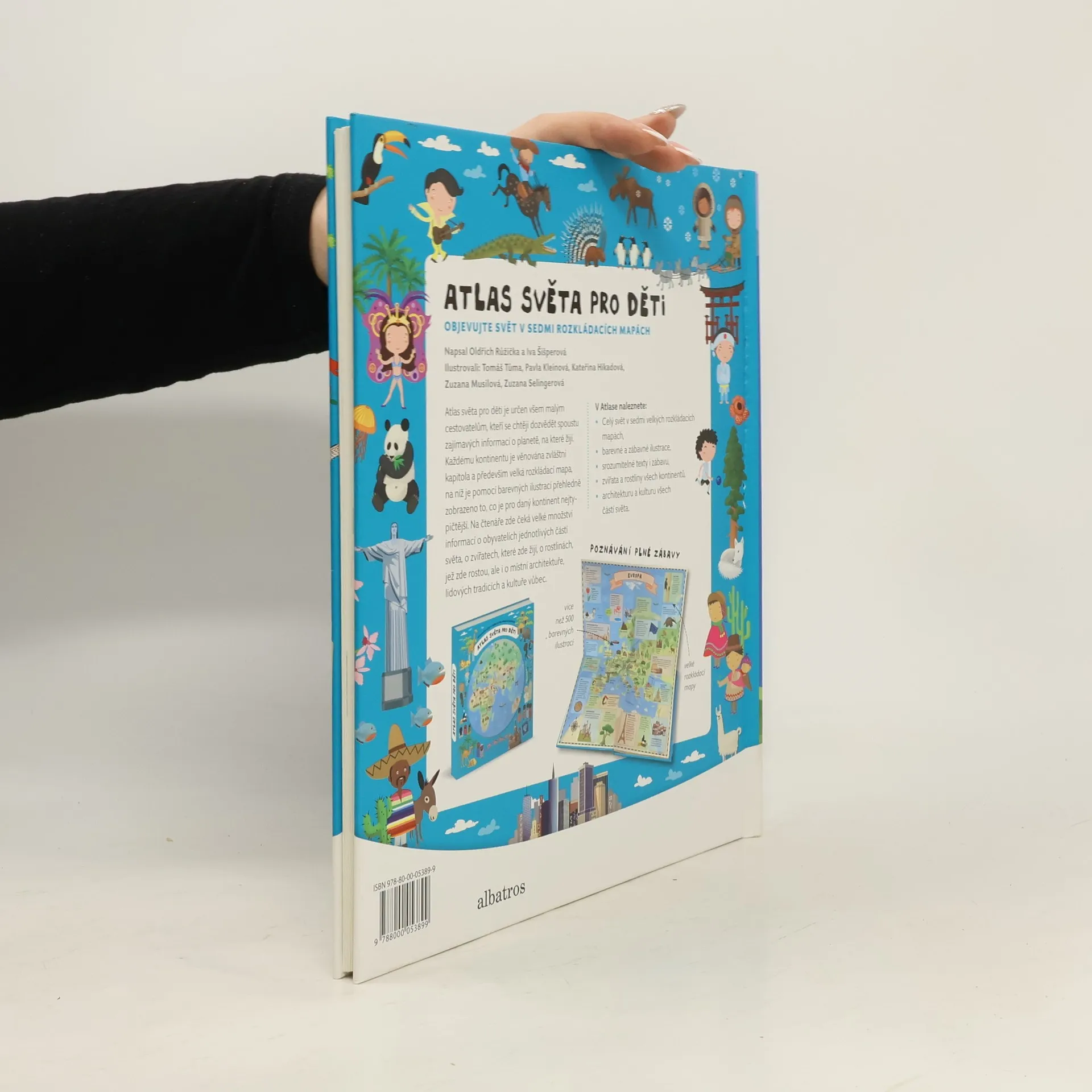 Atlas světa pro děti je určen všem malým cestovatelům, kteří se chtějí dozvědět spoustu zajímavých informací o planetě, na které žijí. Každému kontinentu je věnována zvláštní kapitola a především velká rozkládací mapa, na níž je pomoci barevných ilustrací přehledně zobrazeno to, co je pro daný kontinent nejtypičtější. Na čtenáře zde čeká velké množství informací o obyvatelích jednotlivých částí světa, o zvířatech, které zde žijí, o rostlinách, jež zde rostou, ale i o místní architektuře, lidových tradicích a kultuře vůbec. V Atlase naleznete celý svět v sedmi velkých rozkládacích mapách, patnáct vložených sešitků plných dalších podrobností a informací, barevné a zábavné ilustrace, srozumitelné texty i zábavu, zvířata a rostliny všech kontinentů, architekturu a kulturu všech částí světa.
