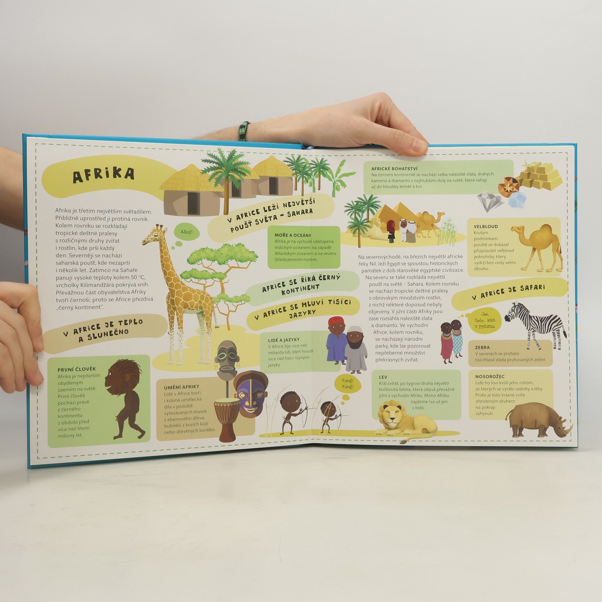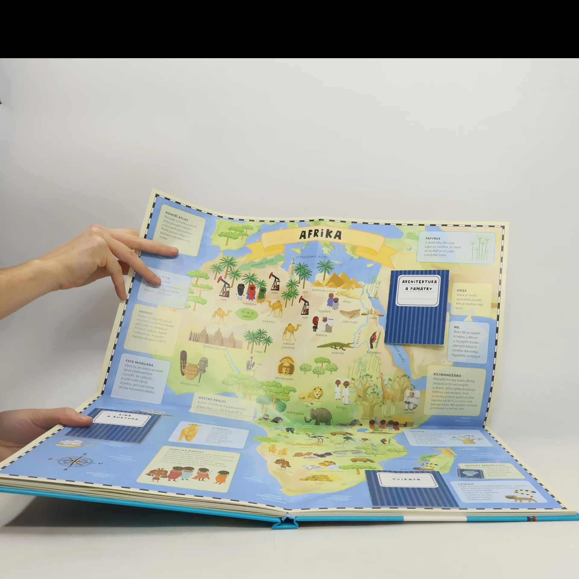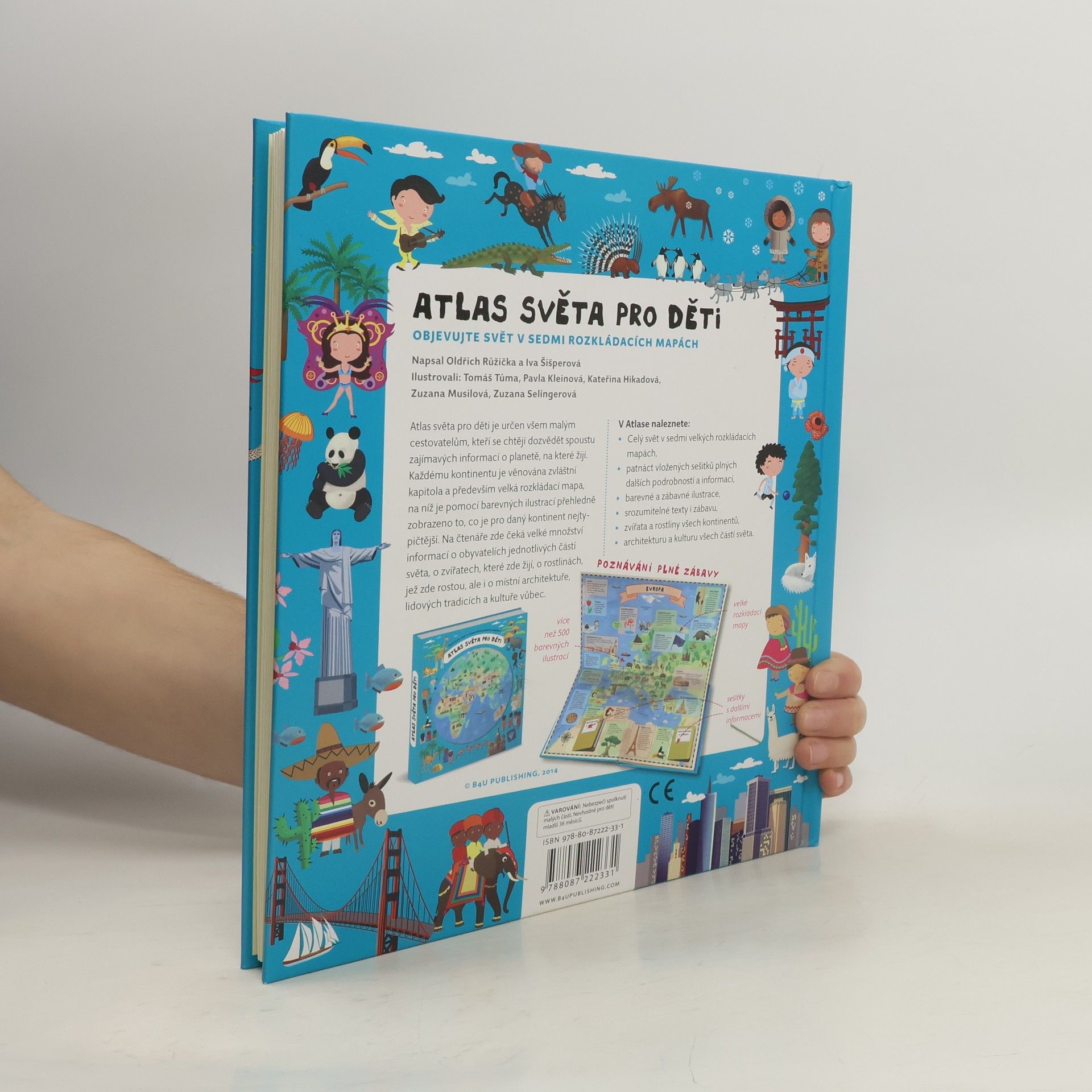 Atlas světa pro děti je určen všem malým cestovatelům, kteří se chtějí dozvědět spoustu zajímavých informací o planetě, na které žijí. Každému kontinentu je věnována zvláštní kapitola a především velká rozkládací mapa, na níž je pomoci barevných ilustrací přehledně zobrazeno to, co je pro daný kontinent nejtypičtější. Na čtenáře zde čeká velké množství informací o obyvatelích jednotlivých částí světa, o zvířatech, které zde žijí, o rostlinách, jež zde rostou, ale i o místní architektuře, lidových tradicích a kultuře vůbec. V Atlase naleznete celý svět v sedmi velkých rozkládacích mapách, patnáct vložených sešitků plných dalších podrobností a informací, barevné a zábavné ilustrace, srozumitelné texty i zábavu, zvířata a rostliny všech kontinentů, architekturu a kulturu všech částí světa.