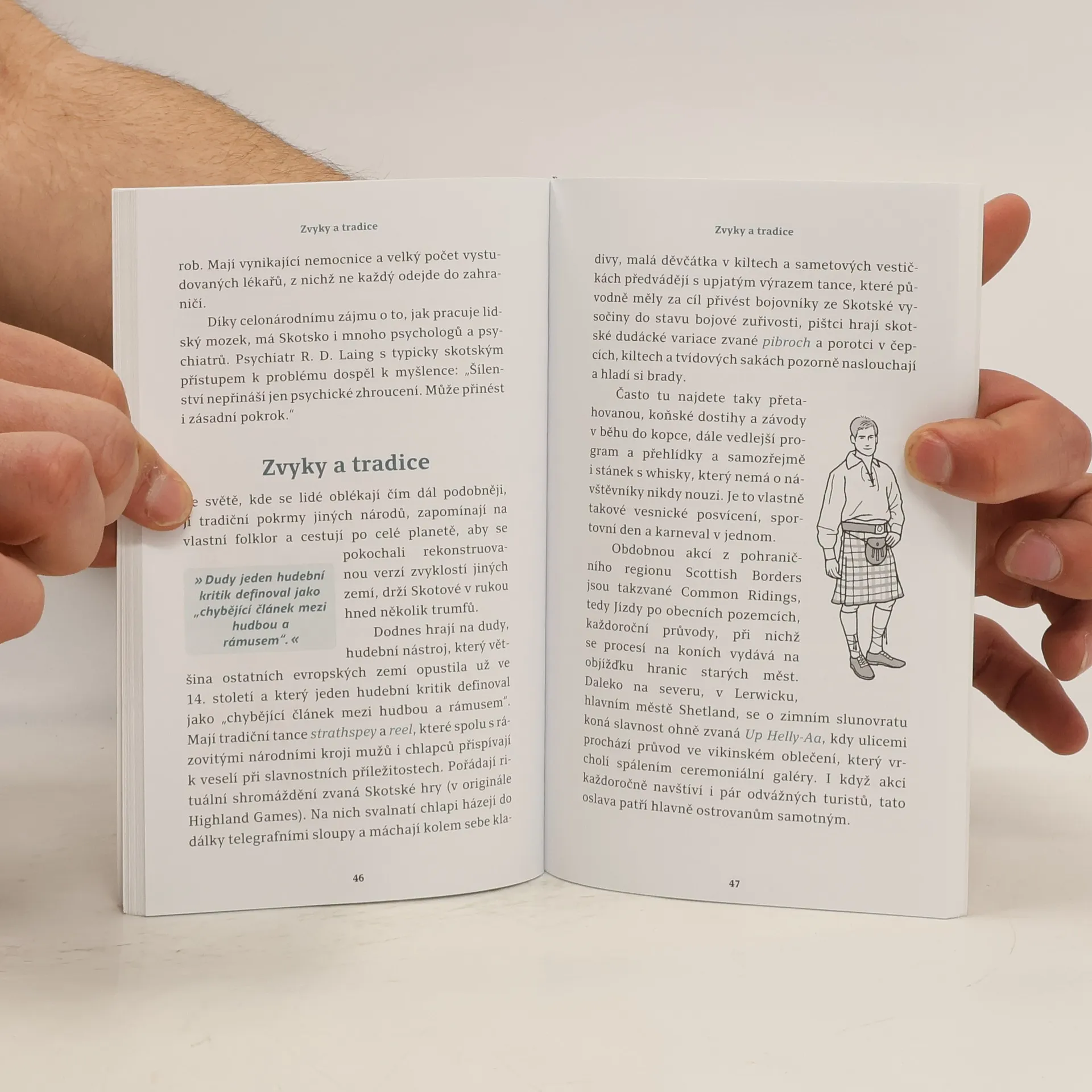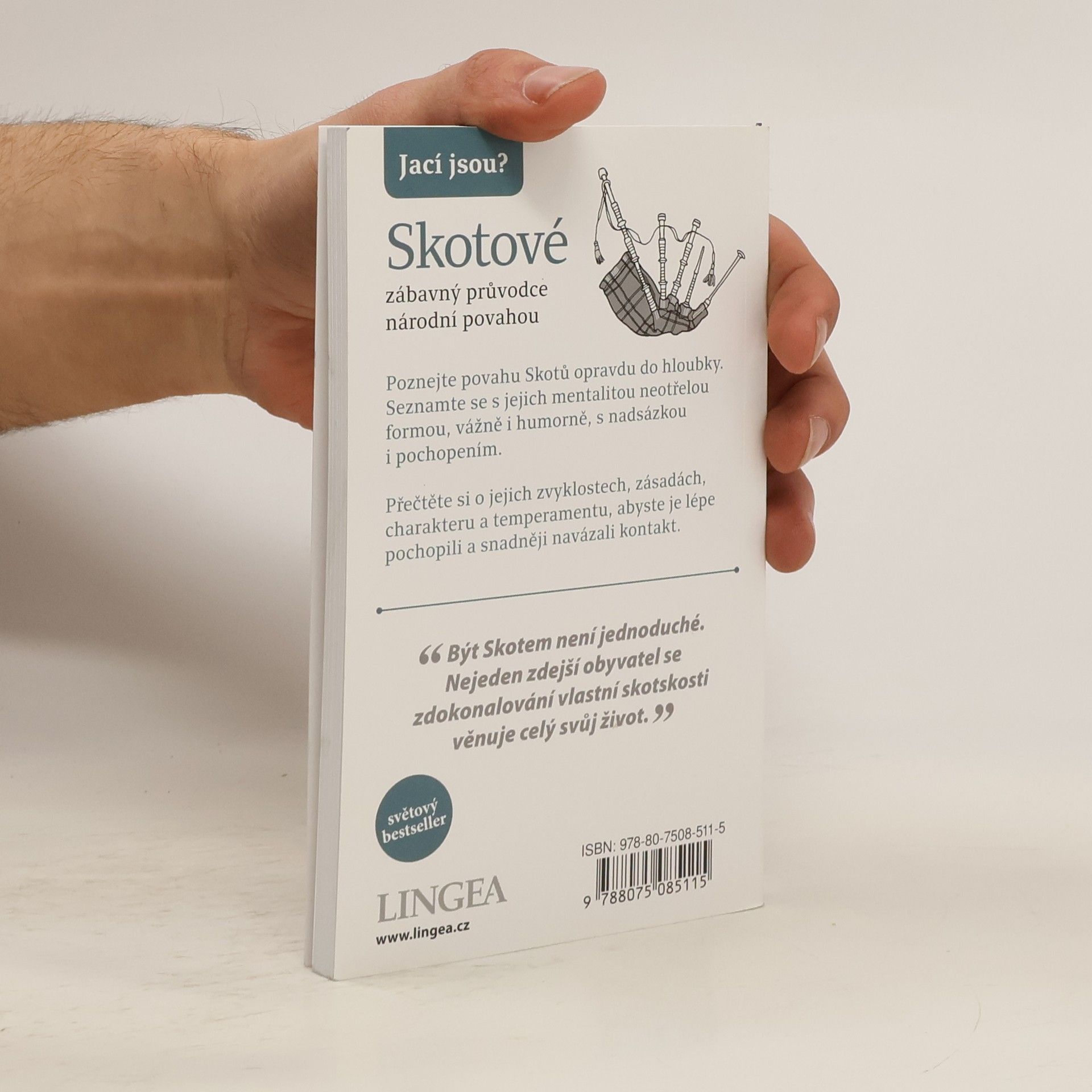 Zábavný průvodce povahou Skotů poutavou formou popisuje jejich životní styl. Dozvíte se, jací Skotové jsou, jak se baví a jak funguje jejich rodina, škola i společnost. Tento svérázný národ je plný protikladů: rozvážní i divocí, tradicionalisté i inovátoři, emocionální a plní zábran. Přečtete si fakta a zajímavosti o jejich každodenním životě, abyste je lépe pochopili a snadněji s nimi navázali kontakt. Skotové se považují za srdečné lidi se smyslem pro humor, nezávislé, ale žijící pro svou komunitu. Historie šetrnosti před průmyslovou revolucí se odráží v jejich národní povaze – když mají peníze, spoří. Velmi si cení svých tradic; dodnes hrají na dudy a pořádají divoké slavnosti, tance a zábavu, která může být pro cizince nepochopitelná, jako házení telegrafními sloupy. Skotský humor je cynický a často se vyznačuje vážnou tváří. Skotsko není kulinářské centrum, ale Skotové konzumují více sladkého pečiva a moučníků než jakýkoli jiný národ. Největším exportním artiklem je whisky, přičemž mnozí Skotové se snaží zkonzumovat veškerou domácí produkci. Zde je nejoblíbenější nealko nápoj jiný než coca-cola. Kniha nabízí zábavný pohled na každodenní život Skotů, abyste je lépe pochopili a inspirovali se jejich temperamentem.