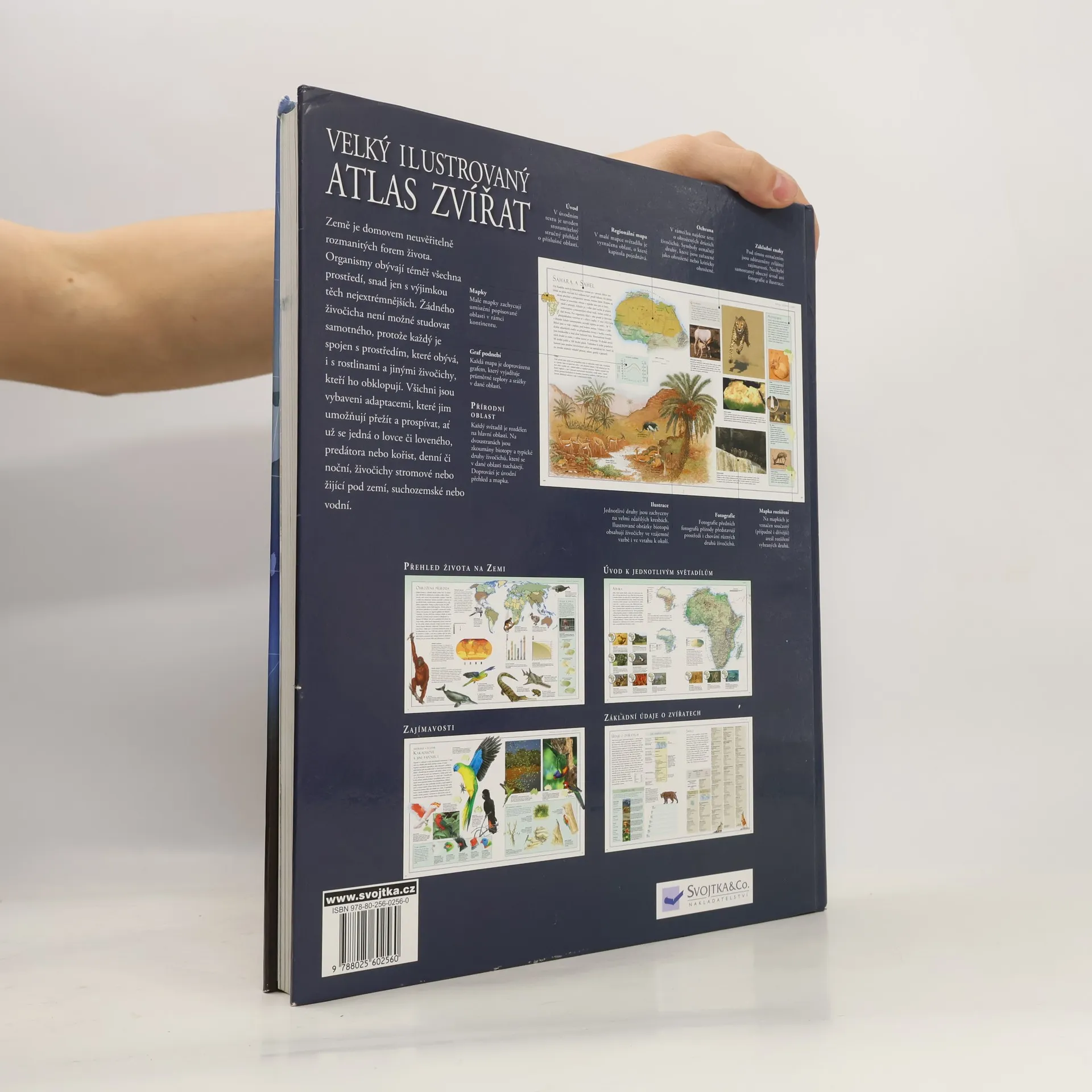 Každý světadíl je v knize rozdělen na hlavní oblasti. Každé obasti je věnována dvoustrana, na které jsou zkoumány biotopy a typické druhy živocichů, které se v dané oblasti nacházejí. Jednotlivé druhy jsou zachyceny na velmi zdařilých kresbách, ilustrované obrázky biotopu obsahují živočichy ve vzájemné vazbě a ve vztahu k okolí. Fotografie předních fotografů přírody zde představují prostředí i chování různých druhů živocichů. Viděli jste někdy vačici vážící méně než 14 gramů nebo kolonii 50 milionů mravenců na pochodu? Víte, kteří živočichové se nejlépe uzpůsobili životu na Sahaře? Země je plná neuvěřitelných živočichů, kteří se úspěšně adaptovali k životu i na nehostinných místech naší planety. Ilustrovaný atlas zvířat vám umožní zblízka nahlédnout do fantastického světa zvířat a jejich přirozeného prostředí. Je rozčleněn na osm částí uspořádaných podle kontinentů a biotopů. Poutavý text v knize je umocněn barevnými ilustracemi, skvělými fotografiemi, satelitními snímky a mapami.
