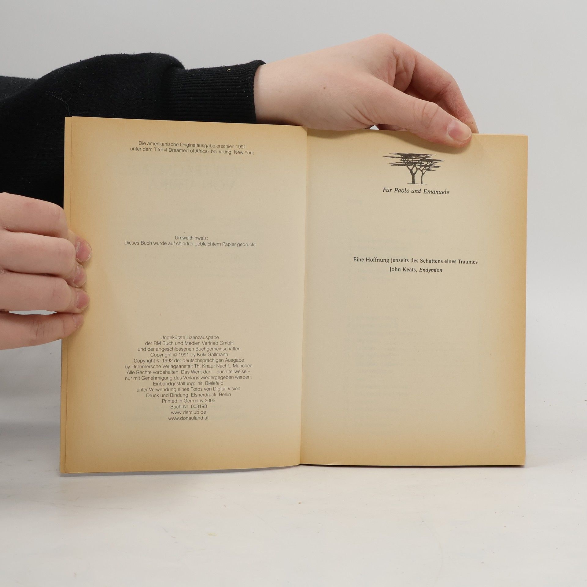 Die gebürtige Italienerin Kuki Gallmann lebt auf einer Farm in Kenia. Zwei Schicksalsschläge nehmen ihr zuerst den Mann, dann den Sohn. Aber die Liebe zur Wahlheimat Afrika und ihren Menschen geben ihr ungeahnte Kräfte. Sie wandelt die Farm in eine Stiftung um, in ein Tier- und Pflanzenreservat, richtet einen Handwerkshof für Frauen ein und initiiert Ausbildungsprogramme für deren Kinder. In diesem Buch erzählt sie ihre anrührende Geschichte.