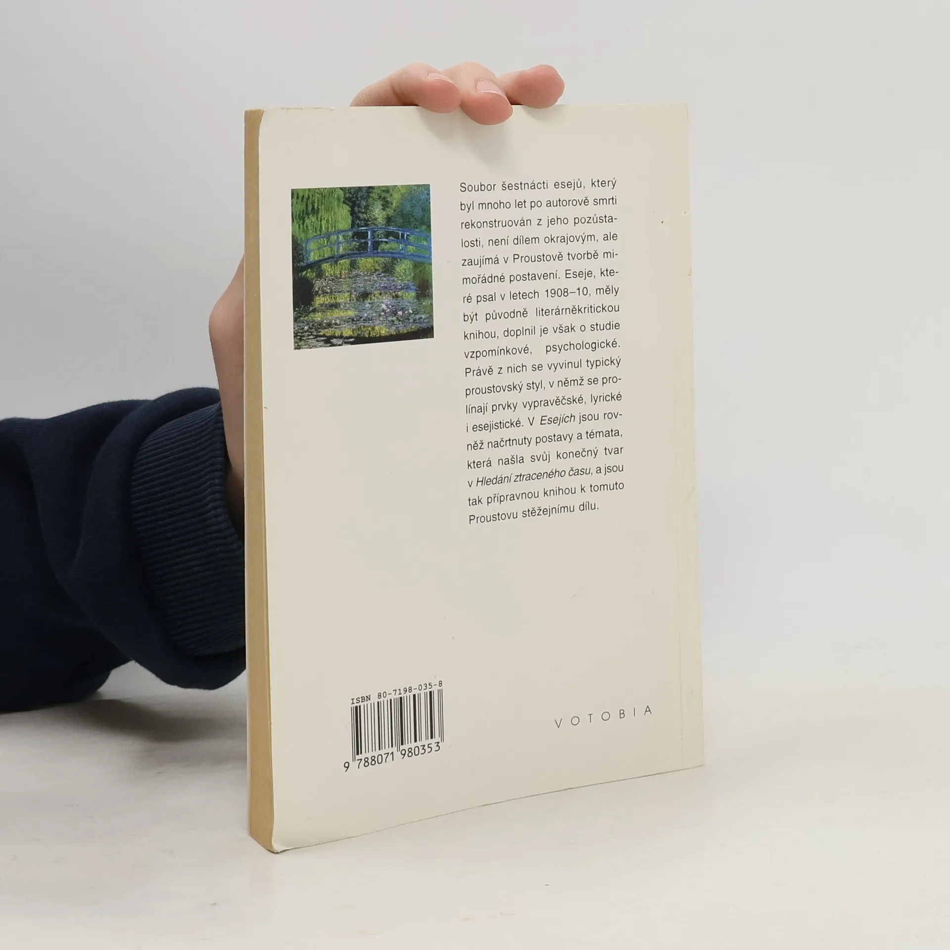 Soubor šestnácti esejů, který byl mnoho let po autorově smrti rekonstruován z jeho pozůstalosti, není dílem okrajovým, ale zaujímá v Proustově tvorbě mimořádné postavení. Eseje, které psal v letech 1908–10, měly být původně literárněkritickou knihou, doplnil je však o studie vzpomínkové, psychologické. Právě z nich se vyvinul typický proustovský styl, v němž se prolínají prvky vypravěčské, lyrické i esejistické. V Esejích jsou rovněž načrtnuty postavy a témata, která našla svůj konečný tvar v Hledání ztraceného času, a jsou tak přípravnou knihou k tomuto Proustovu stěžejnímu dílu. Baudelairovy verše přeložil Ivan Slavík. Druhé, opravené vydání. Na obálce „Lekníny“ Clauda Moneta.