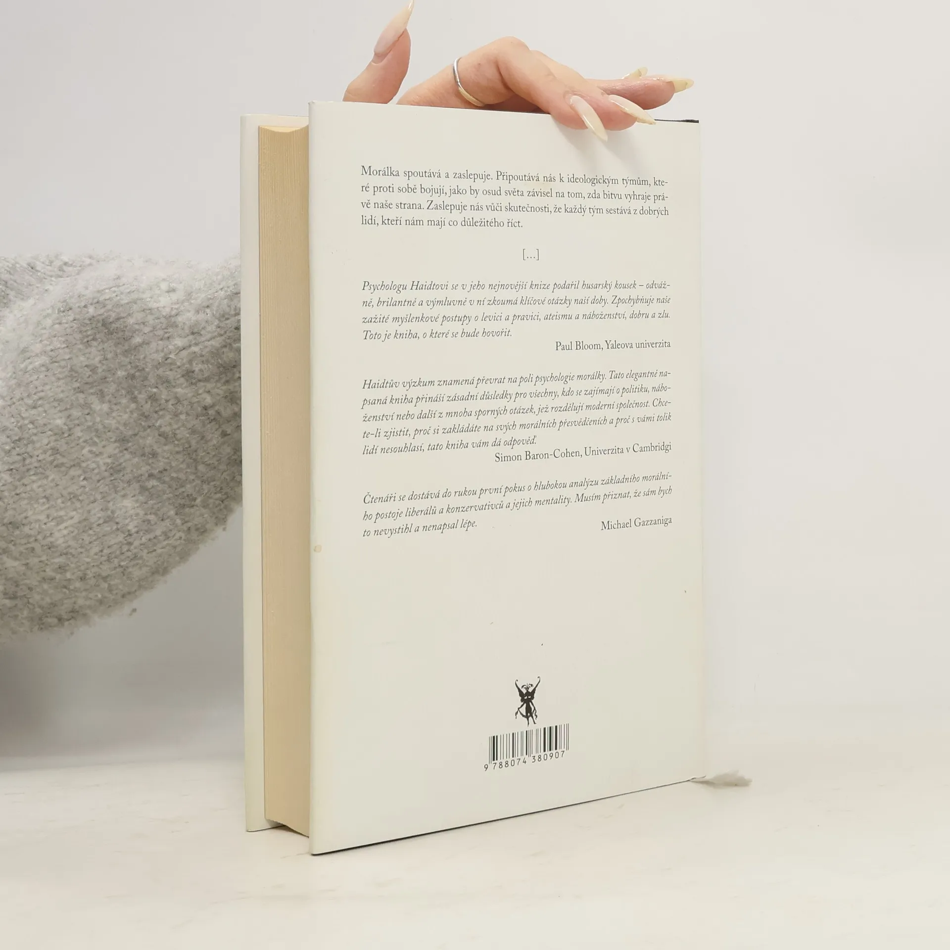 Proč existují rozdíly v lidském jednání a rozhodování? Jakou roli hraje morálka v našem uvažování? Tyto otázky zkoumá psycholog Jonathan Haidt. Analyzuje teorie starých filozofů a dospívá k současným debatám o původu morálky: je vrozená, nebo formována zkušenostmi z dětství? Pokud je vrozená, proč se názory na morální témata liší napříč kulturami? A pokud je získaná, jak to, že lze nalézt opakující se vzorce? Haidt tvrdí, že naše morální úsudky vycházejí z intuice, zatímco rozumové uvažování slouží k obhajobě těchto intuic. Jsme tedy spíše „intuitivní právníci“, kteří hledají argumenty pro své názory. Haidtovo vyprávění je obohaceno osobními příběhy, jako je jeho dětství, které ho nasměrovalo k levici, a studijní pobyt v Indii, jenž ho přiměl přehodnotit své názory. Popisuje pět základů morálky a ukazuje, proč sympatizanti levice kladou důraz na dva z nich, zatímco pravice se opírá o všechny. Tím odhaluje nedorozumění, která z toho vyplývají. Dokáže tato kniha zúžit propast mezi individualistickými a sociocentrickými společnostmi a mezi politickou levicí a pravicí?