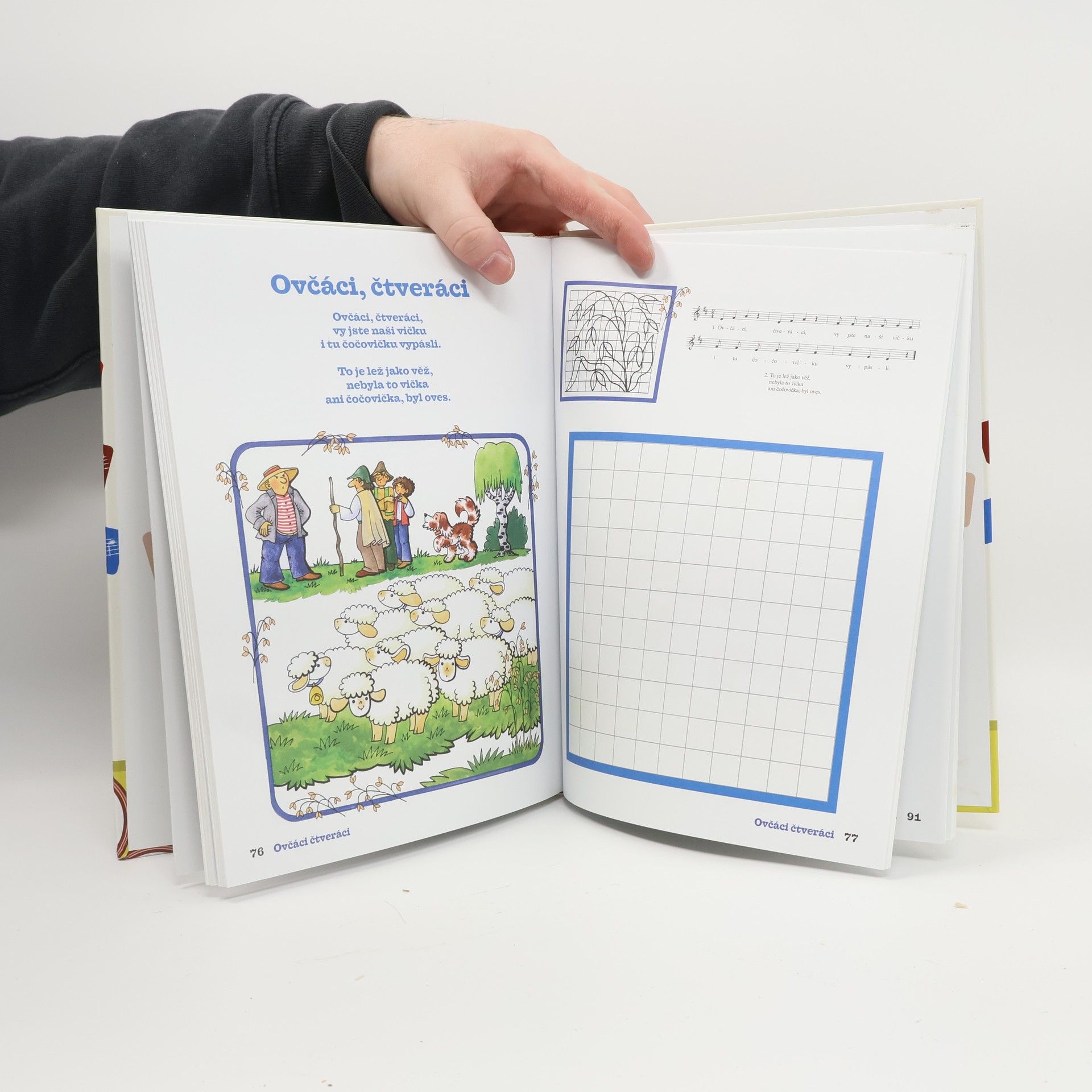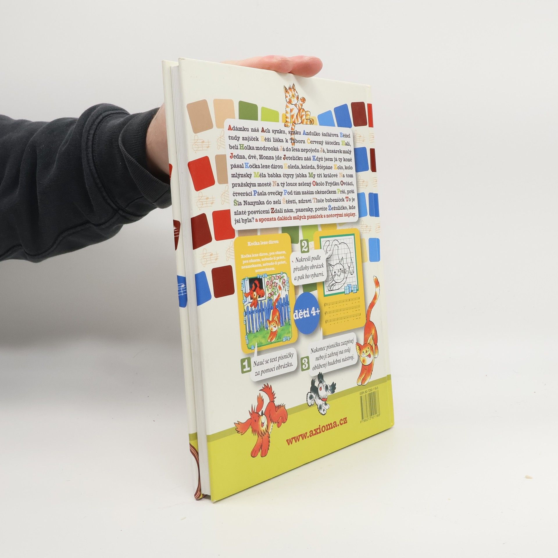 Kniha obsahuje několik desítek lidových písniček, jejichž text si děti zapamatují za pomoci velkých barevných obrázků a mohou si je také zahrát na svůj hudební nástoj podle notového zápisu. Menší děti si pak mohou ke každé písničce nakreslit obrázek a vybarvit si ho.