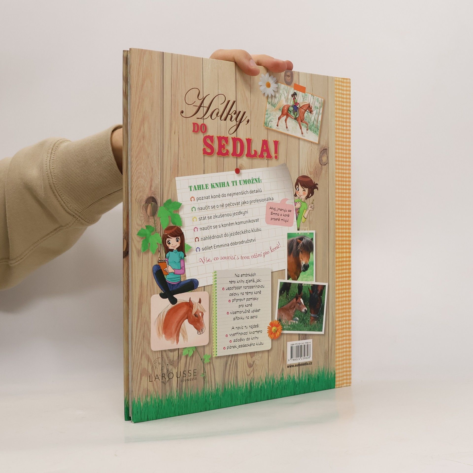 Emmě je dvanáct a už od sedmi let nadšeně jezdí na koni. Ve svém jezdeckém klubu má svého oblíbeného koně a v této knížce se z ní stává zábavná a poučená průvodkyně pro všechny začátečnice, kterým ukazuje, co všechno je třeba zvládnout, aby se z nich mohly stát opravdové jezdkyně. Nejen užitečné rady, nápady a tipy, ale také hry, vystřihovánky, hry a spousta dalších zajímavostí pro všechny malé koňačky. Zdroj: www.neoluxor.cz