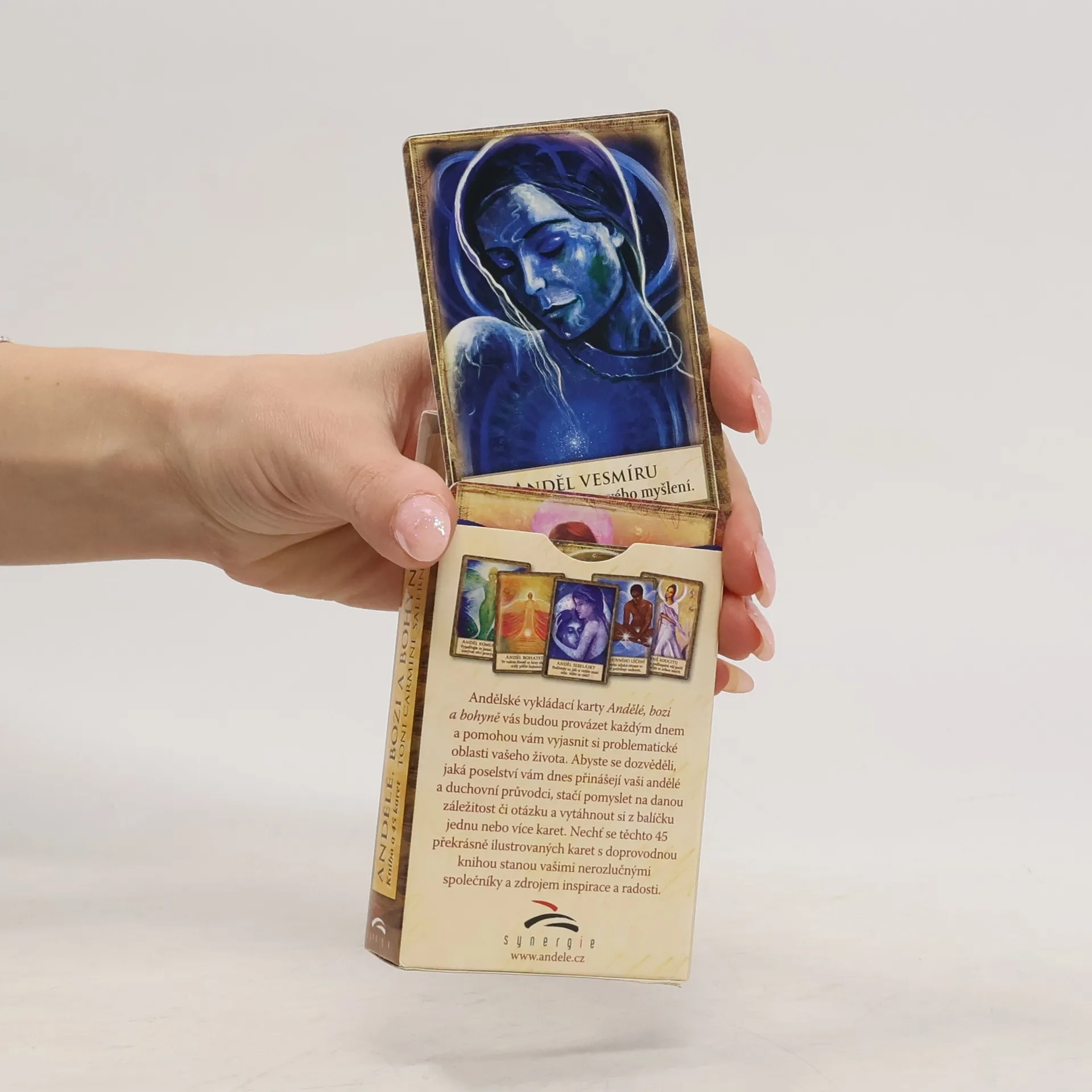 Andělské vykládací karty Andělé, bozi a bohyně vás budou provázet každým dnem a pomohou vám objasnit problematické oblasti vašeho života. Abyste se dozvěděli, jaká poselství vám dnes přinášejí vaši andělé a duchovní průvodci, stačí pomyslet na danou záležitost či otázku a vytáhnout si z balíčku jednu nebo více karet. Nechť se těchto 45 překrásně ilustrovaných karet s doprovodnou knihou stanou vašimi nerozlučnými společníky.