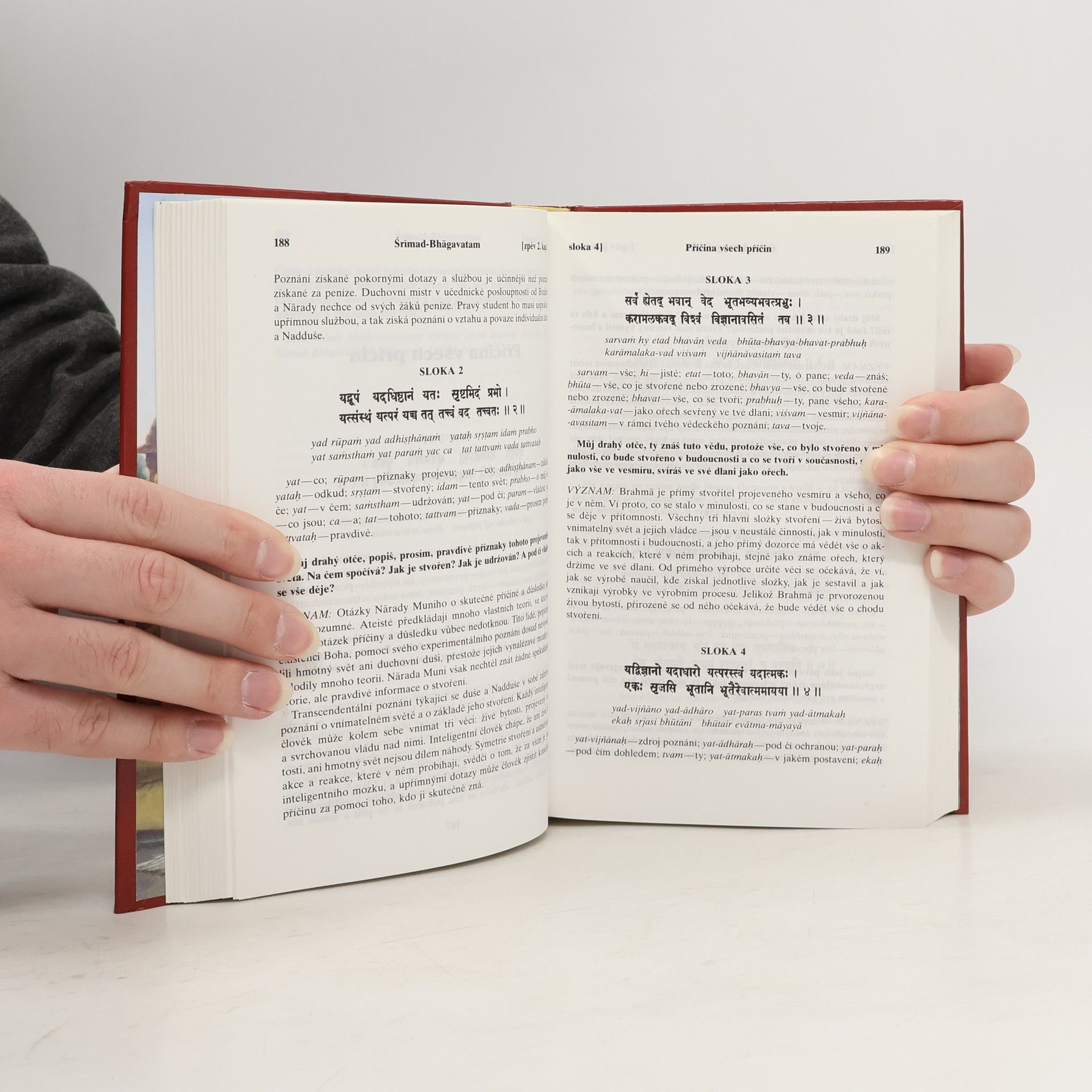 Zpěv druhý "Vesmírný projev" s původními sanskrtskými texty, přepisem do anglického písma, českými synonymy, překlady a podrobnými výklady.