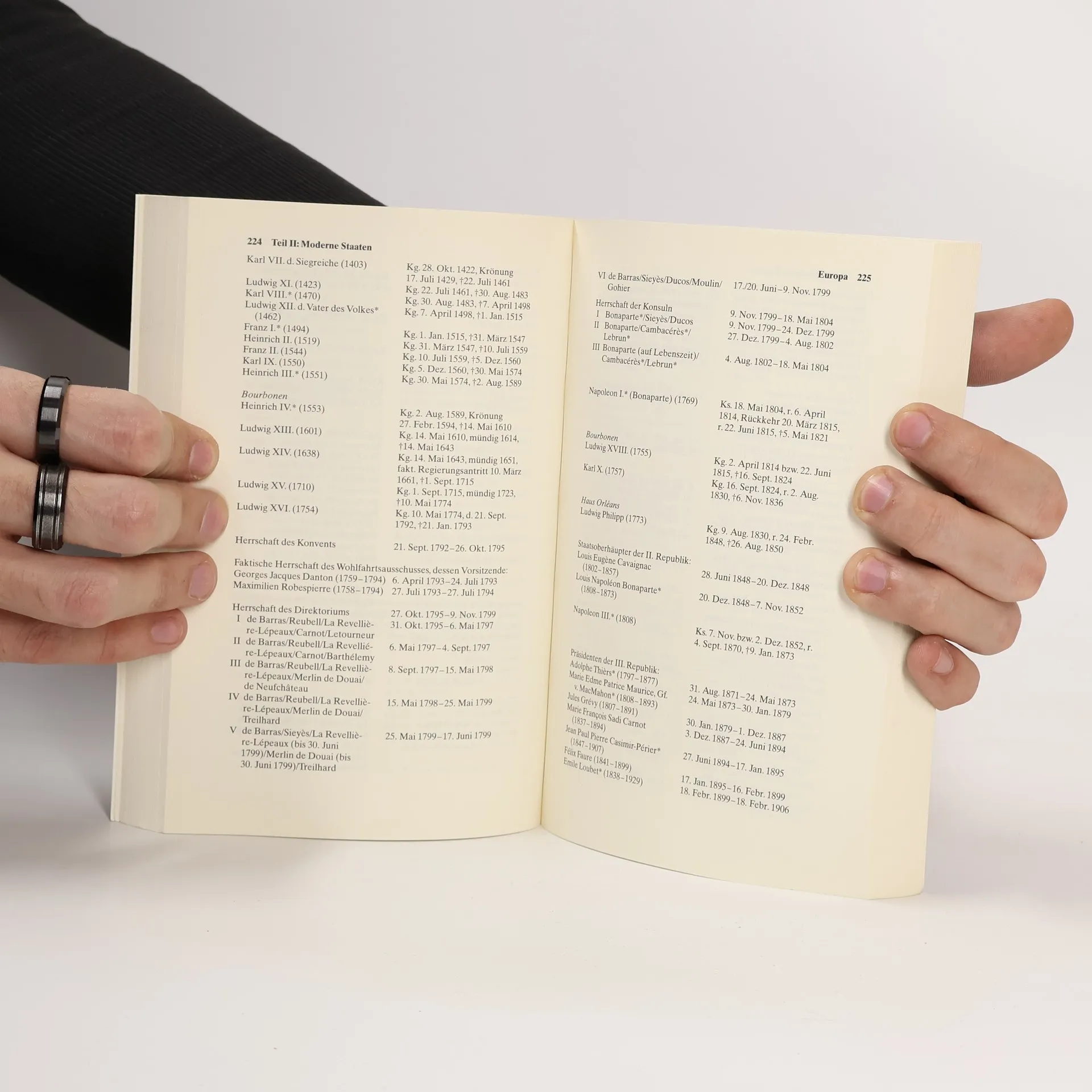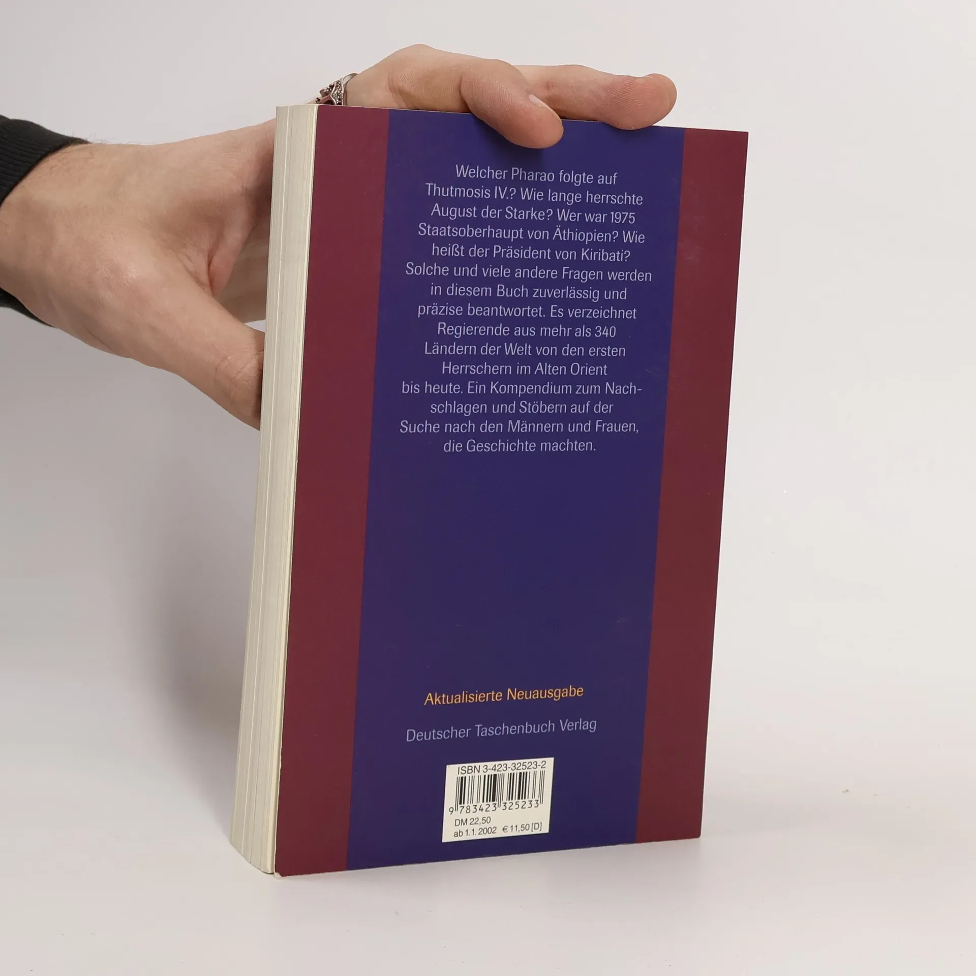 Wie hieß der Vorgänger Ramses' II., und welcher römische Kaiser folgte auf Diokletian? Wie lange regierten Karl-August von Sachsen-Weimar und die Zarin Katharina II.? Wer herrschte 1880 in El Salvador? Wer war beim Kriegsausbruch 1914 französischer Regierungschef? Auf solche und ähnliche Fragen nach den Männern und Frauen, die Geschichte machten oder von der Geschichte gemacht wurden, gibt dieses Buch zuverlässige Antwort. Die Regententabellen verzeichnen Kaiser und Päpste, Zaren und Sultane, Könige und Landesfürsten, Präsidenten, Diktatoren und Regierungschefs sowie für uns wichtige Minister mit ihren Lebens- und Regierungsdaten in chronologischer Folge in insgesamt mehr als 340 untergegangenen oder noch existierenden Staaten und Territorien. Sie reichen vom Pharao Menes (2950 v. Chr.) bis in die jüngste Gegenwart. Das Buch ist universalhistorisch angelegt, jedoch ist den Daten zur deutschen Geschichte ein besonders großer Raum gewidmet: Die Regenten zahlreicher früherer deutscher Territorien sind aufgeführt und für die Zeit nach 1918 die Regierungschefs der Länder sowie die Reichs- und Bundesminister.