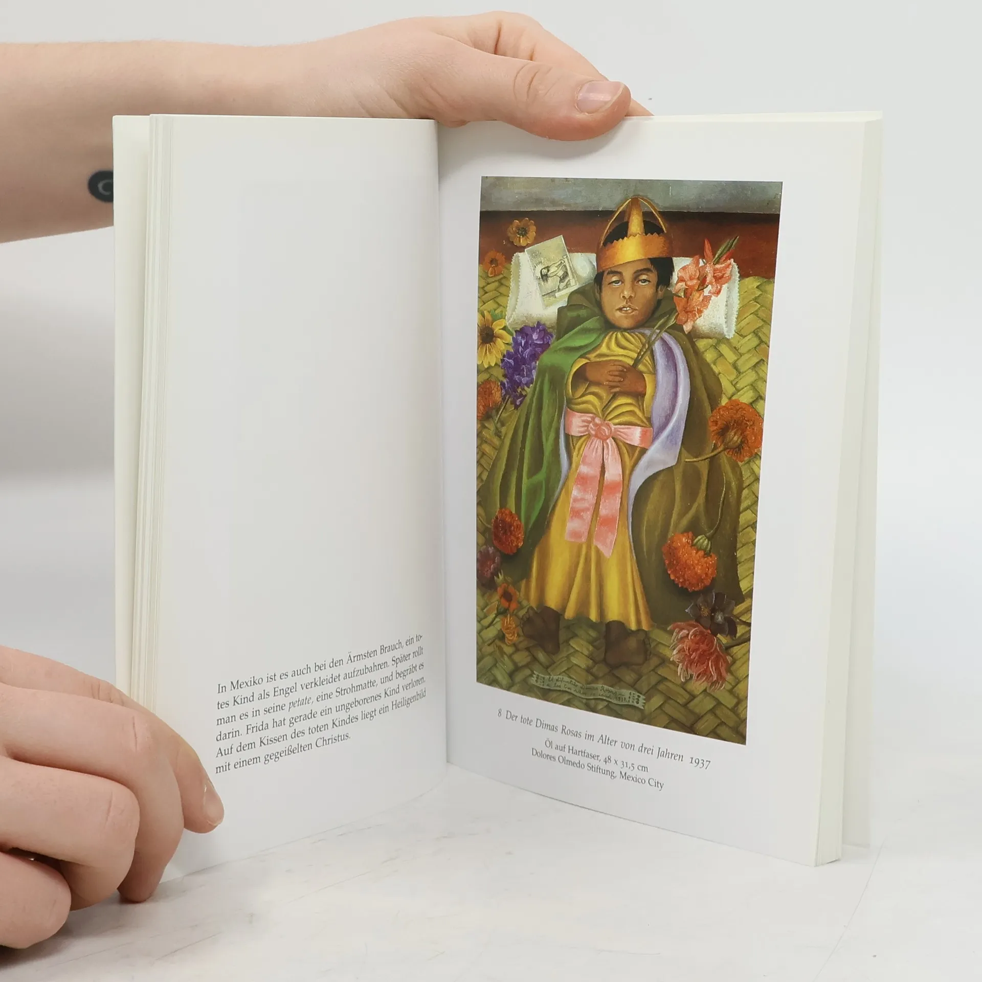 Die Entdeckung der mexikanischen Malerin Frida Kahlo (1907-1954) fand in Europa erst vor einem Jahrzehnt statt. Seitdem ist das Interesse des Publikums an ihrem stark autobiographisch geprägten Werk nicht mehr aufzuhalten. In Frida Kahlos Gesamtwerk - etwa hundertfünfzig meist kleinformatige Bilder auf Leinwand, Pappe, Holz oder Blech - sind die Selbstportraits der wesentliche Teil, der sich vom Beginn ihrer Beschäftigung mit der Malerei bis an ihr Lebensende, also über achtundzwanzig Jahre, nahezu durch alle Schaffensphasen zieht. Er gibt fast lückenlos die Auseinandersetzung mit der eigenen Person wieder - eine Autobiographie in Selbstbildnissen. Immer wird die Thematik durch die oft leidensvolle Vita der Künstlerin bestimmt - ihre Beziehung zu dem Maler Diego Rivera, ihr körperliches Befinden, ihre Natur- und Lebensphilosophie, ihr individualmythologisch geprägtes Weltbild. Dabei entwickelt Frida Kahlo ihre eigene Bildsprache aus den Elementen alter präkolumbianischer Kultur, mexikanischer Volkskunst, Votivmalerei und surrealistischen Einflüssen.