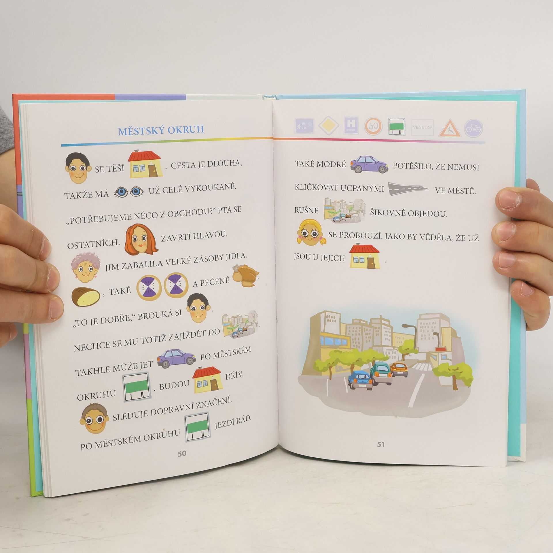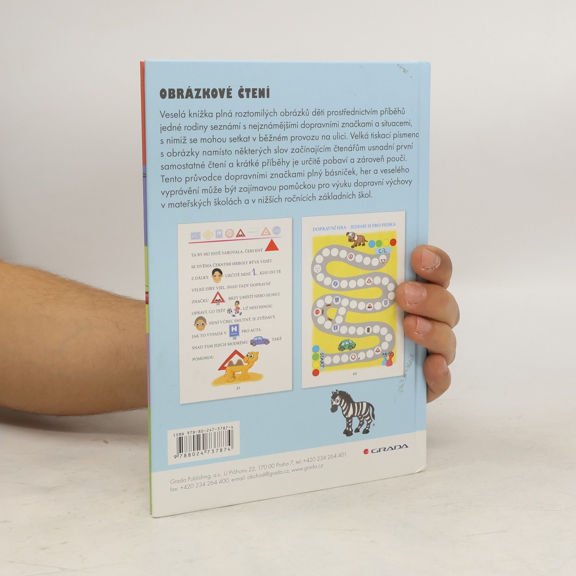 Veselá knížka plná roztomilých obrázků děti prostřednictvím příběhů jedné rodiny seznámí s nejznámějšími dopravními značkami a situacemi, s nimiž se mohou setkat v běžném provozu na ulici. Tento průvodce dopravními značkami plný básniček, her a veselého vyprávění může být zajímavou pomůckou pro výuku dopravní výchovy v mateřských školách a v nižších ročnících základních škol. Velká tiskací písmena s obrázky namísto některých slov začínajícím čtenářům usnadní první samostatné čtení a krátké příběhy je určitě pobaví a zároveň poučí.