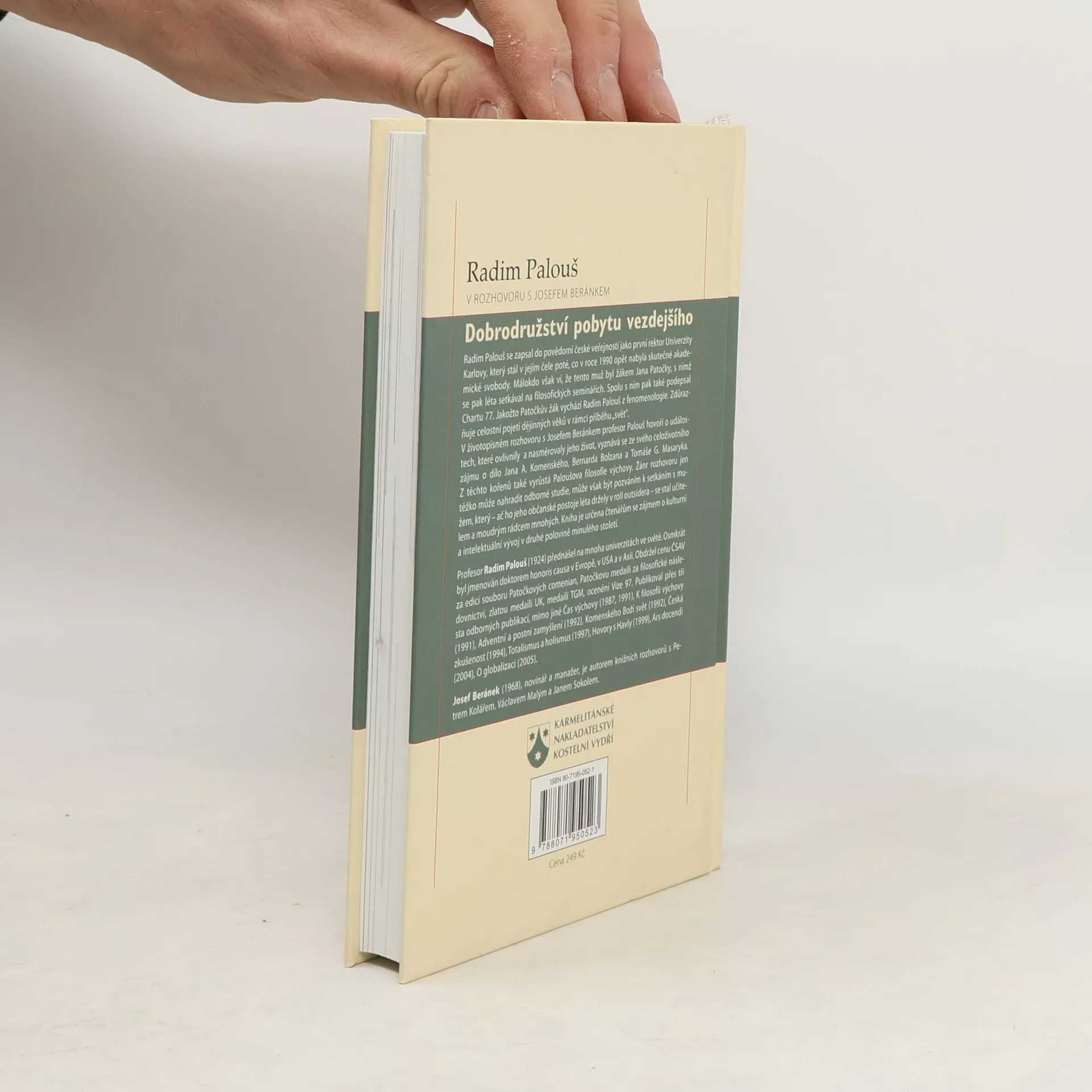 Radim Palouš v rozhovoru s Josefem Beránkem. V životopisném rozhovoru s publicistou Josefem Beránkem (autorem rozhovorů s V. Malým, P. Kolářem a J. Sokolem) profesor Palouš hovoří o událostech, které ovlivnily a nasměrovaly jeho život, vyznává se ze svého celoživotního zájmu o dílo Jana A. Komenského, Bernarda Bolzana a Tomáše G. Masaryka. Z těchto kořenů také vyrůstá Paloušova filosofie výchovy. Žánr rozhovoru může být pozvánkou k setkání s mužem, který - ač ho jeho občanské postoje léta držely v roli outsidera - se stal učitelem a moudrým rádcem mnohých. Profesor Radim Palouš (1924) přednášel na mnoha univerzitách ve světě. Osmkrát byl jmenován doktorem honoris causa v Evropě, v USA a v Asii. Obdržel řadu ocenění, publikoval přes tři sta odborných statí a publikací.