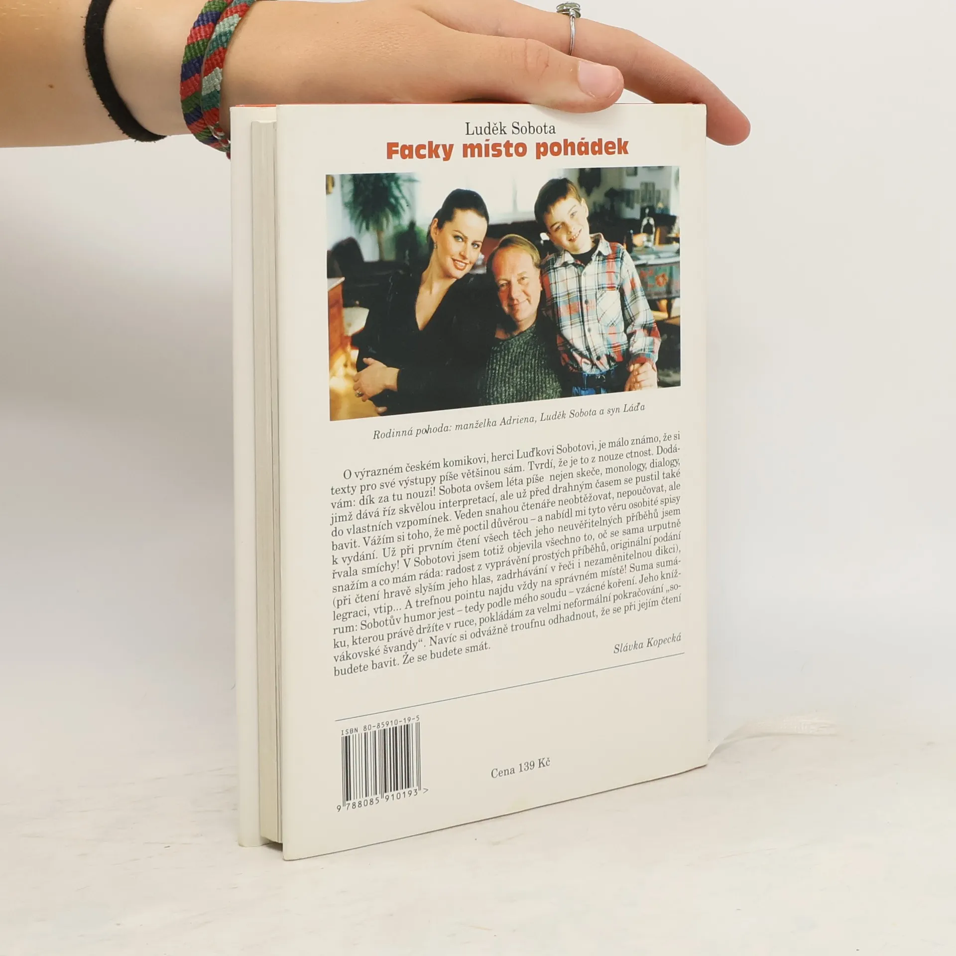 O výrazném českém komikovi, herci L. Sobotovi, je málo známo, že si texty pro své výstupy píše většinou sám. Tvrdí, že je to z nouze ctnost. Dodávám: dík za tu nouzi! Sobota ovšem léta píše nejen skeče, monology, dialogy, jímž dává říz skvělou interpretací, ale už před drahným časem se pustil také do vlastních vzpomínek. Vážím si toho, že mě poctil důvěrou a nabídl mi tyto věru osobité spisy k vydání. Už při prvním čtení všech těch jeho neuvěřitelných příběhů jsem řvala smíchy! Suma sumárum: Sobotův humor jest tedy podle mého soudu vzácné koření. Jeho knížku, kterou právě držíte v ruce, pokládám za velmi neformální pokračování "sovákovské švandy". Navíc si odvážně troufnu odhadnout,že se při jejím čtení budete bavit. Slávka Kopecká