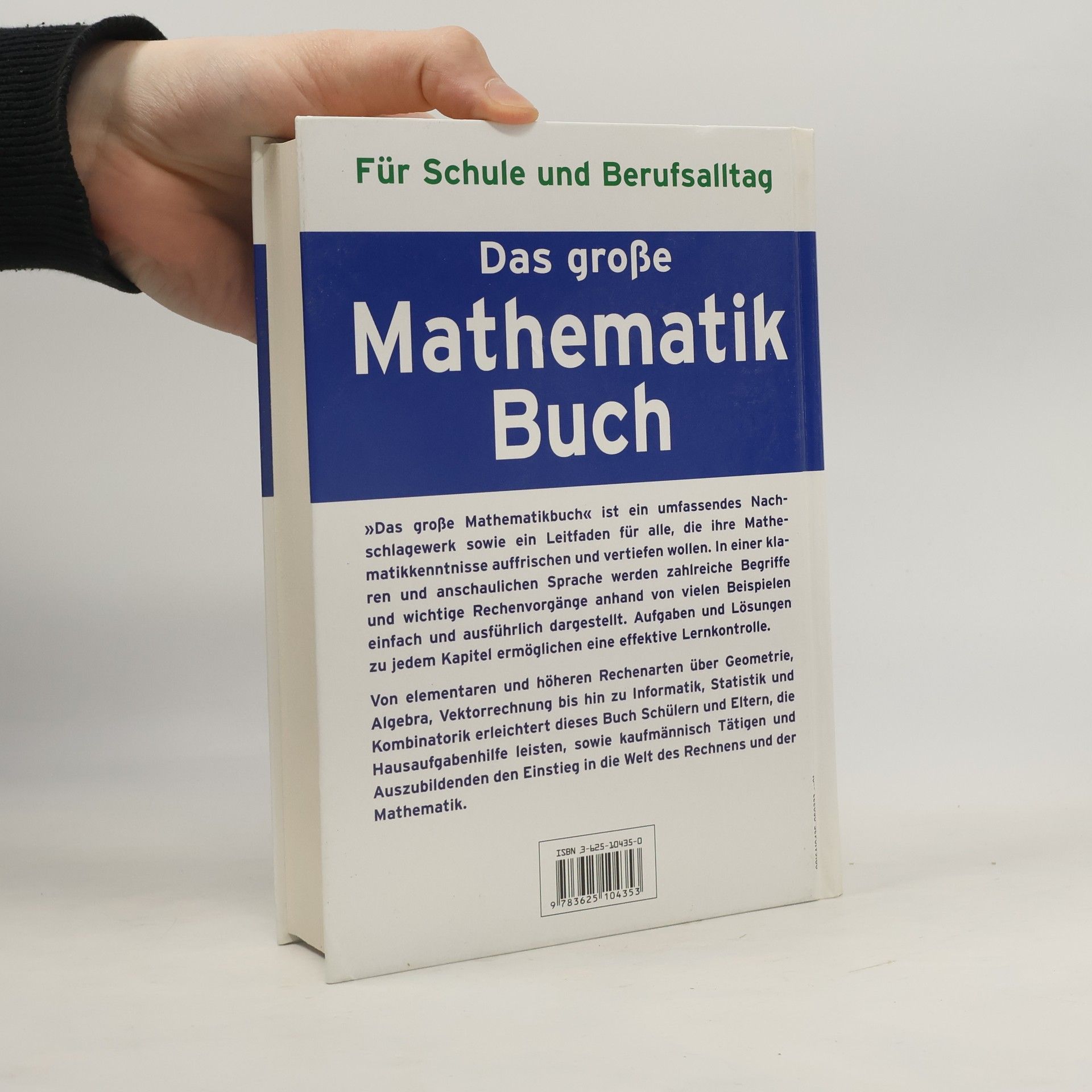 „Das große Mathematikbuch“ ist ein umfassendes Nachschlagewerk sowie ein Leitfaden für alle, die ihre Mathematikkenntnisse auffrischen und vertiefen wollen. In einer klaren und anschaulichen Sprache werden zahlreiche Begriffe und wichtige Rechenvorgänge anhand von vielen Beispielen einfach und ausführlich dargestellt. Aufgaben und Lösungen zu jedem Kapitel ermöglichen eine effektive Lernkontrolle. Von elementaren und höheren Rechenarten über Geometrie, Algebra, Vektorrechnung bis hin zu Informatik, Statistik und Kombinatorik erleichtert dieses Buch Schülern und Eltern, die Hausaufgabenhilfe leisten, sowie kaufmännisch Tätigen und Auszubildenden den Einstieg in die Welt des Rechnens und der Mathematik.