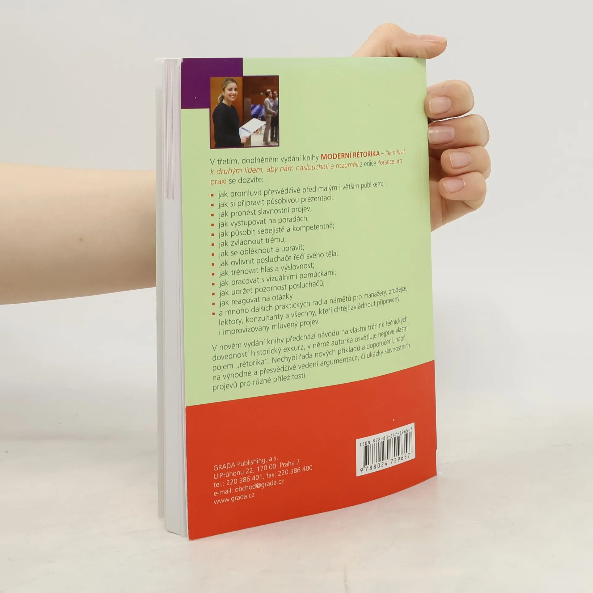 Jak si připravit svůj projev a prezentaci? Jak promluvit přesvědčivě před posluchači a udržet jejich pozornost? Jak zvládnout trému a působit sebejistě a kompetentně? Jak se obléknout a upravit? Jak ovlivnit posluchače řečí těla? Jak trénovat hlas a výslovnost? Jak reagovat na otázky a vystupovat na poradách? Jak pracovat s pomůckami? Jak pronést slavnostní projev? V novém, aktualizovaném vydání úspěšné příručky vám autorka sympaticky, fundovaně a spolehlivě tyto dotazy na mnoha příkladech a tipech zodpoví, jako by předávala své zkušenosti reálnému klientovi. Knížka je určena všem, kteří chtějí zvládnout připravený i improvizovaný mluvený projev.