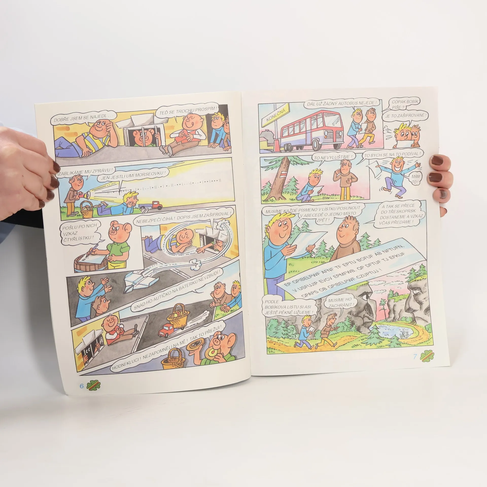 Bobík jde pro Myšpulína koupit do města součástky na nový vynález. Bobík vše nakoupí, potká ho ale svalovec, který ho zažene do sklepa, kde ho uvězní. Svalovec má ještě malého kumpána a ti chtějí po Bobíkovi, aby napsal dopis Myšpulínovi. Chtějí vyměnit Bobíka za pilulky na urychlení růstu, aby mohli ukrást trezor v kanceláři jednoho mrakodrapu. U okýnka do sklepa se objeví dva kluci a ti rádi Bobíkovi pomůžou, nevědí ale, kde leží Třeskoprsky, nejsou přece na mapě. Bobík napíše dopis pro kamarády a pošle s ním kluky. Do Třeskoprsk se jde přes pohádkovou zem! Kluci zazvoní u Čtyřlístku a vysvětlí situaci. Myšpulín chce lumpy napálit a připraví pro ně naopak pilulky na zmenšení. Čtyřlístek přiletí v létajících neckách k únoscům, kteří pilulky vyzkoušejí a ihned se zmenší na velikost myši, do jejichž nory se běží před Čtyřlístkem schovat. Lumpové prolezou až pod auto a když se oba náhle zvětší, objeví se policie a považuje lumpy za zloděje aut. Bobíka trápil při uvěznění nejvíc hlad, naštěstí s sebou Fifinka přivezla zásobu buchet. Čtyřlístek děkuje dvěma klukům za pomoc a na oplátku jim ukáže spoustu věcí a proletí se i raketou, Čtyřlístek je sice z pohádkového světa, nic moderního mu ale není cizí.