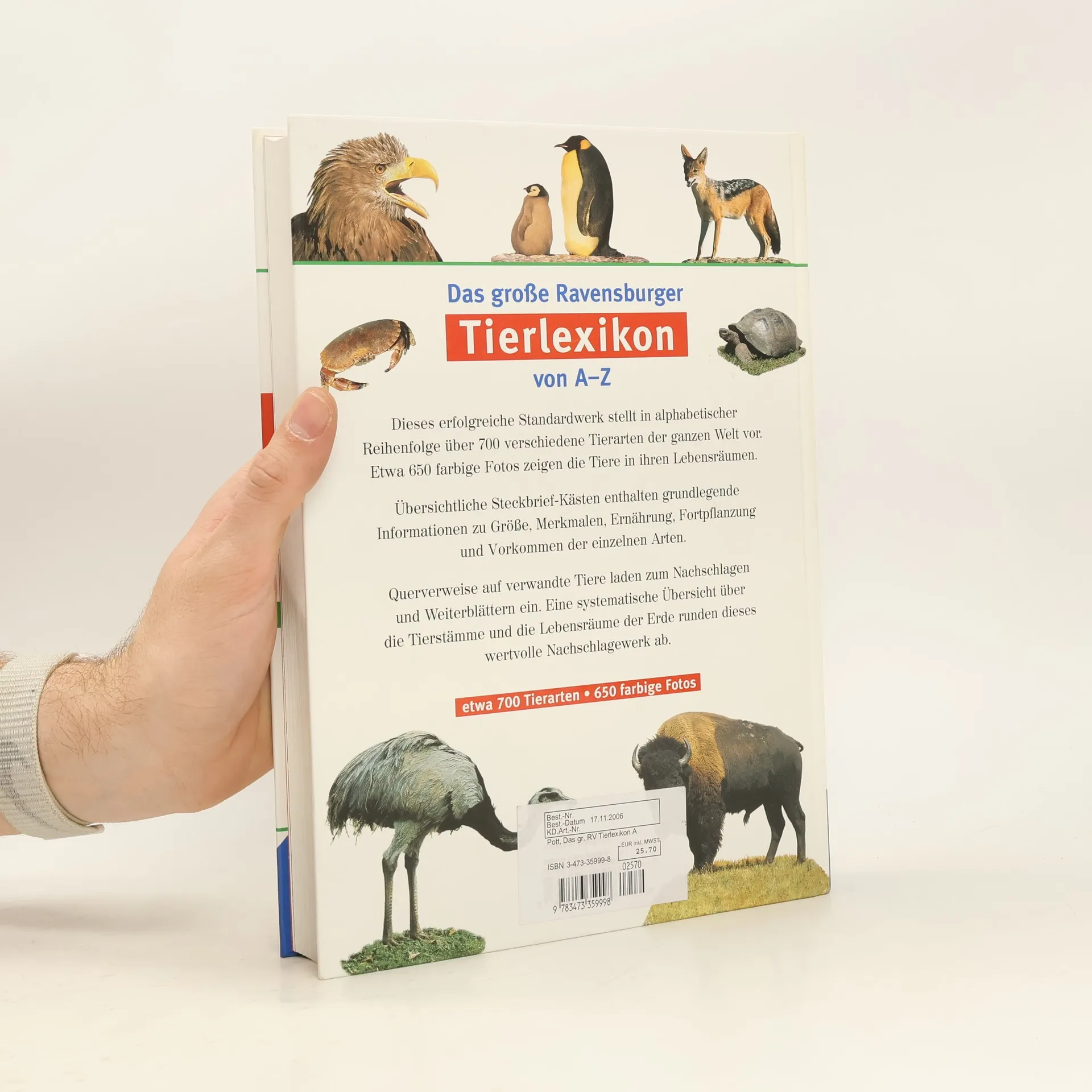 In lebendigen, farbigen Fotos, mit ausführlichen Steckbriefen und kurzen Schilderungen von Verhaltensweisen, Lebensgewohnheiten und Lebensräumen werden hier in alphabetischer Reihenfolge rund 600 Tiere vorgestellt. Ein Buch, das man viele Jahre lang zu Rate ziehen kann. (Ab 8 Jahren.)