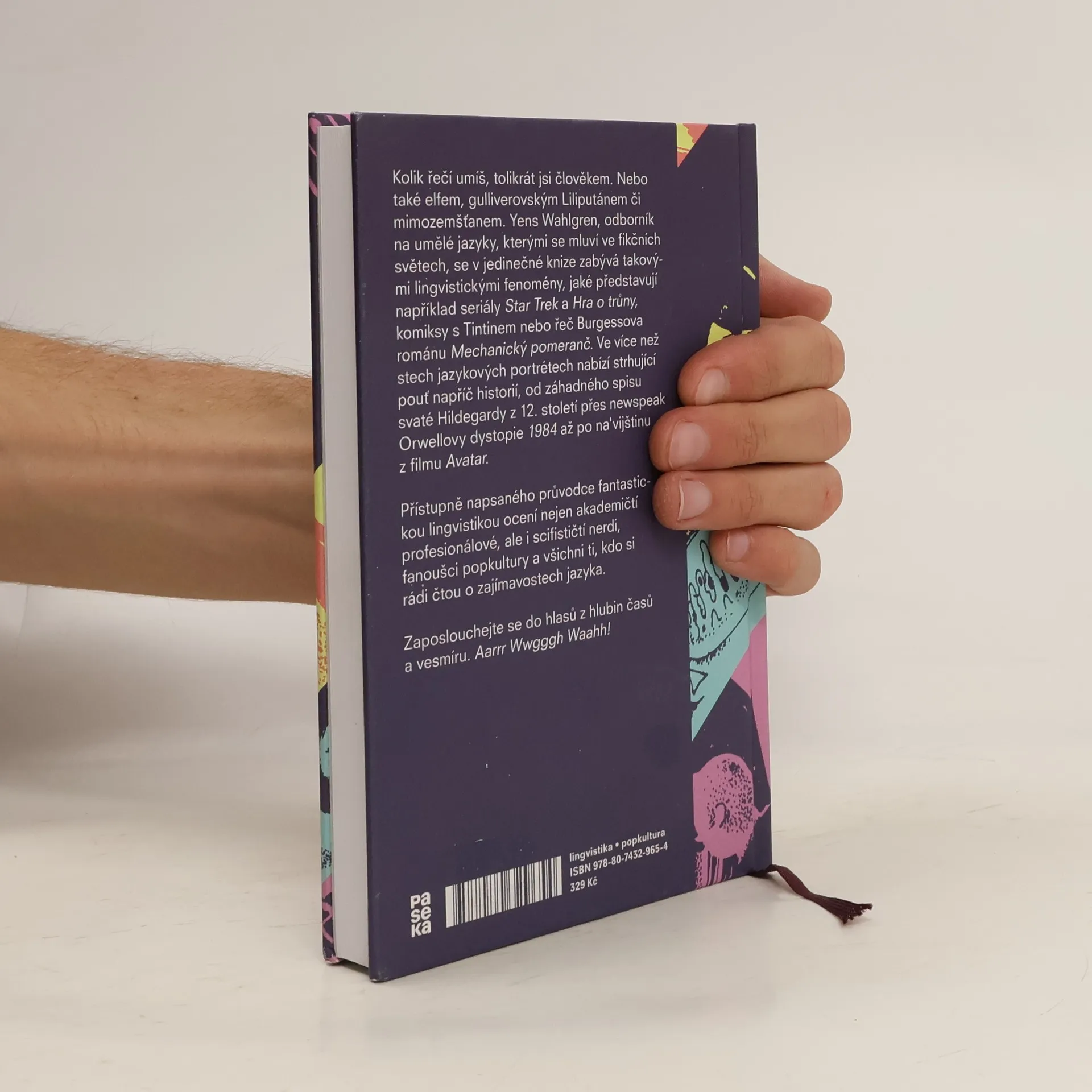 Kolik řečí umíš, tolikrát jsi člověkem. Nebo také elfem, gulliverovským Liliputánem či mimozemšťanem. Yens Wahlgren, odborník na umělé jazyky, kterými se mluví ve fikčních světech, se v jedinečné knize zabývá takovými lingvistickými fenomény, jaké představují například seriály Star Trek a Hra o trůny nebo Tarzanova dobrodružství či komiksy s Tintinem. Ve více než stech jazykových portrétech nabízí strhující pouť napříč historií, od záhadného spisu svaté Hildegardy z 12. století až po newspeak Orwellovy dystopie 1984 a řeč Burgessova Mechanického pomeranče. Přístupně napsaného průvodce fantastickou lingvistikou ocení nejen akademičtí profesionálové, ale i scifističtí nerdi, fanoušci popkultury a ti, kdo si rádi čtou o zajímavostech jazyka. Zaposlouchejte se do hlasů z hlubin časů a vesmíru. Aarrr Wwgggh Waahh!