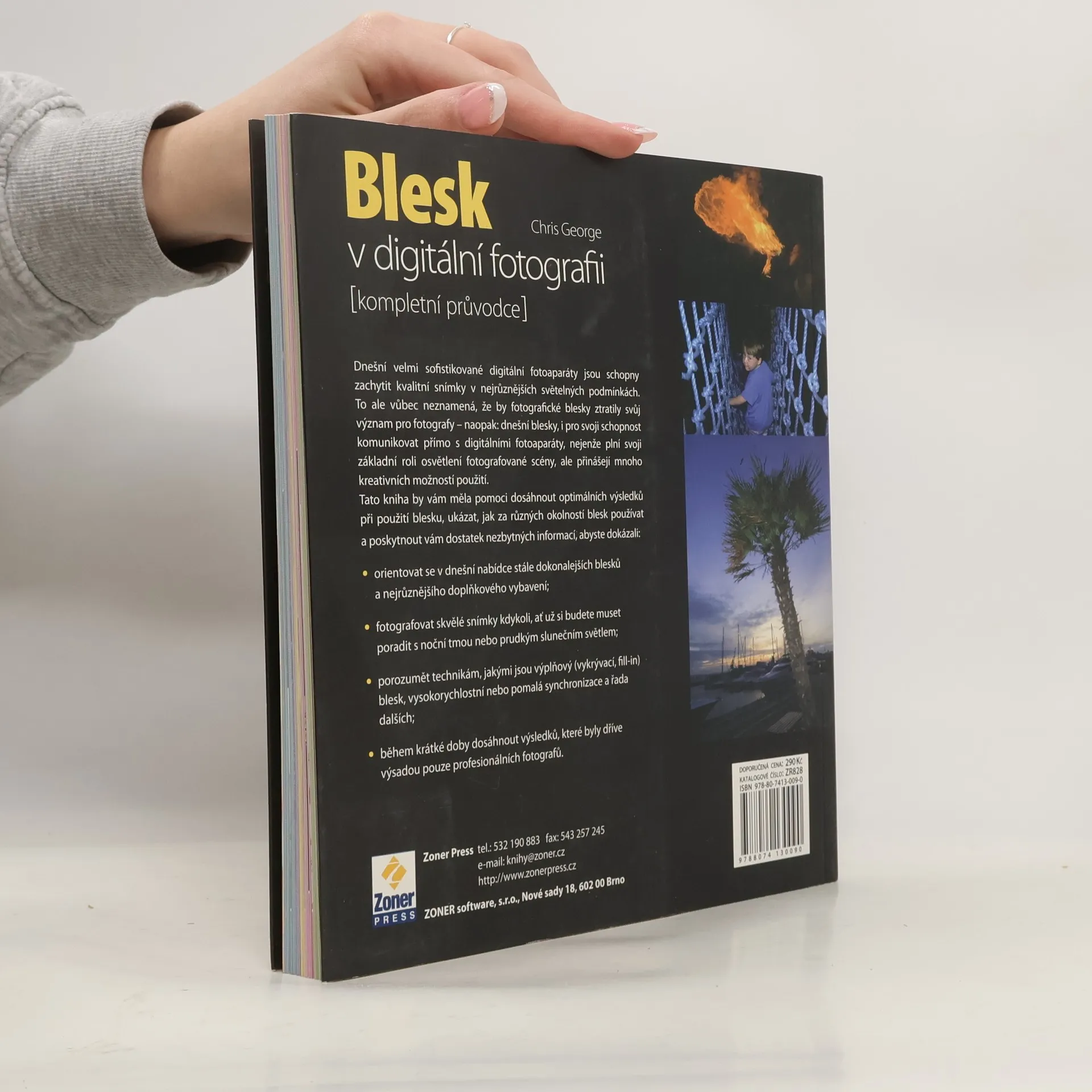 Dnes již velmi širokou sadu knih vydavatelství Zoner Press o fotografování, zejména o digitální fotografii, doplňuje kniha tentokrát věnovaná více technické problematice – blesku. Čtenáři našich knih se s bleskem a jeho použitím mohli setkat v řadě publikací, věnovaných např. fotografování zvěře, makrofotografii, portrétu nebo krajinářské fotografii, konečně bleskem a jeho využitím se zabývá velmi výrazně McNally ve své knize Fotografie – rozhodující momenty. Publikace Blesk v digitální fotografii je ale blesku věnovaná zcela, je určena těm, kteří hledají základního průvodce technikou nebo potřebují vysvětlení nejdůležitějších pojmů, doporučení pro nastavení nebo měření při práci s bleskem. Kniha však vedle čistě technických informací přináší rady i ukázky použití blesku v nejrůznějších podmínkách, v interiéru i exteriéru, od práce se zabudovaným bleskem kompaktních fotoaparátů až po záblesková zařízení a jejich nejrůznější doplňky a pomůcky používané třeba v ateliéru. Kniha je doplněna množstvím inspirativních fotografií, které často ukazují i rozdíly při fotografování bez blesku a s bleskem. Publikace je určena především začínajícím až středně pokročilým fotografům, pro které je fotografování koníčkem.