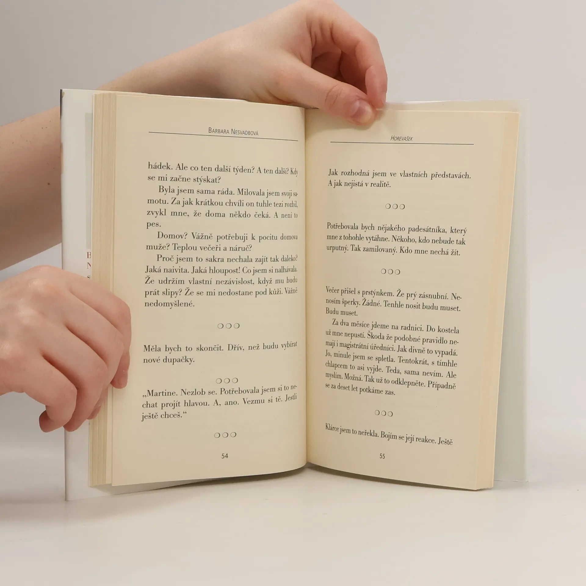 První z novel je příběhem dvou kamarádek z vysoké školy, z nichž jedna žije v Londýně a druhá v Praze. Jana nemůže dýchat ve svazku s dominantním mužem s tradičními představami o úloze ženy, Karla je rozvedená a udržuje vztah s mladším mužem, jehož nároky na vztah narážejí na její touhu po svobodě a samostatnosti. Druhá novela vypráví o dvou sestrách, z nichž jedné, ženě podnikatele, se rozpadne manželství a ona bojuje o děti, druhá se zamiluje do ženatého muže...