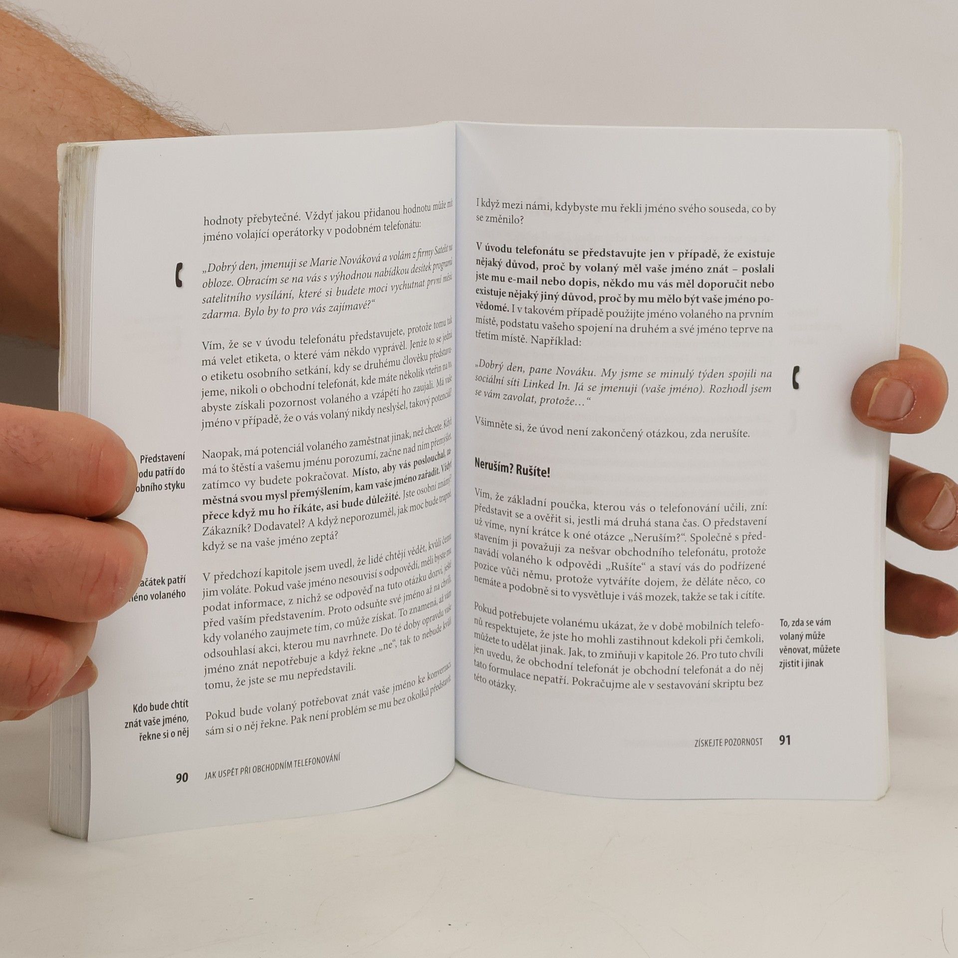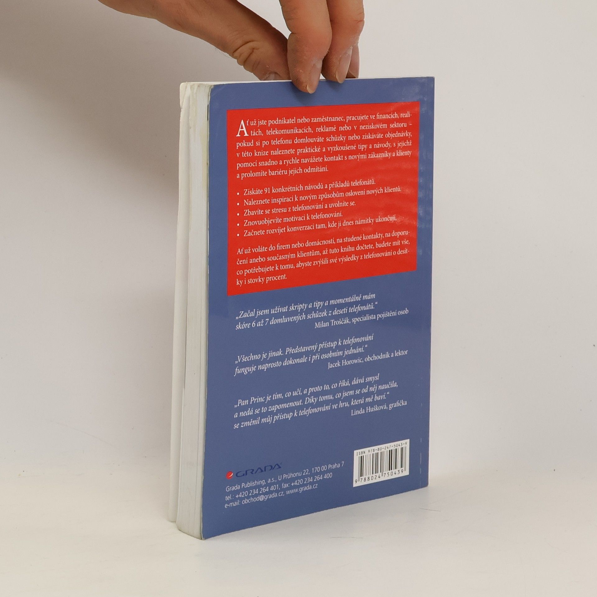 Ať už jste podnikatel nebo zaměstnanec, pracujete ve financích, realitách, telekomunikacích, reklamě nebo v neziskovém sektoru – pokud si po telefonu domlouváte schůzky nebo získáváte objednávky, v této knize naleznete praktické a vyzkoušené tipy a návody, s jejichž pomocí snadno a rychle navážete kontakt s novými zákazníky a klienty a prolomíte bariéru jejich odmítání. * Získáte 91 konkrétních návodů a příkladů telefonátů. * Naleznete inspiraci k novým způsobům oslovení nových klientů. * Zbavíte se stresu z telefonování a uvolníte se. * Znovuobjevíte motivaci k telefonování. * Začnete rozvíjet konverzaci tam, kde ji dnes námitky ukončují. Ať už voláte do firem nebo domácností, na studené kontakty, na doporučení anebo současným klientům, až tuto knihu dočtete, budete mít vše, co potřebujete k tomu, abyste zvýšili své výsledky z telefonování o desítky i stovky procent.