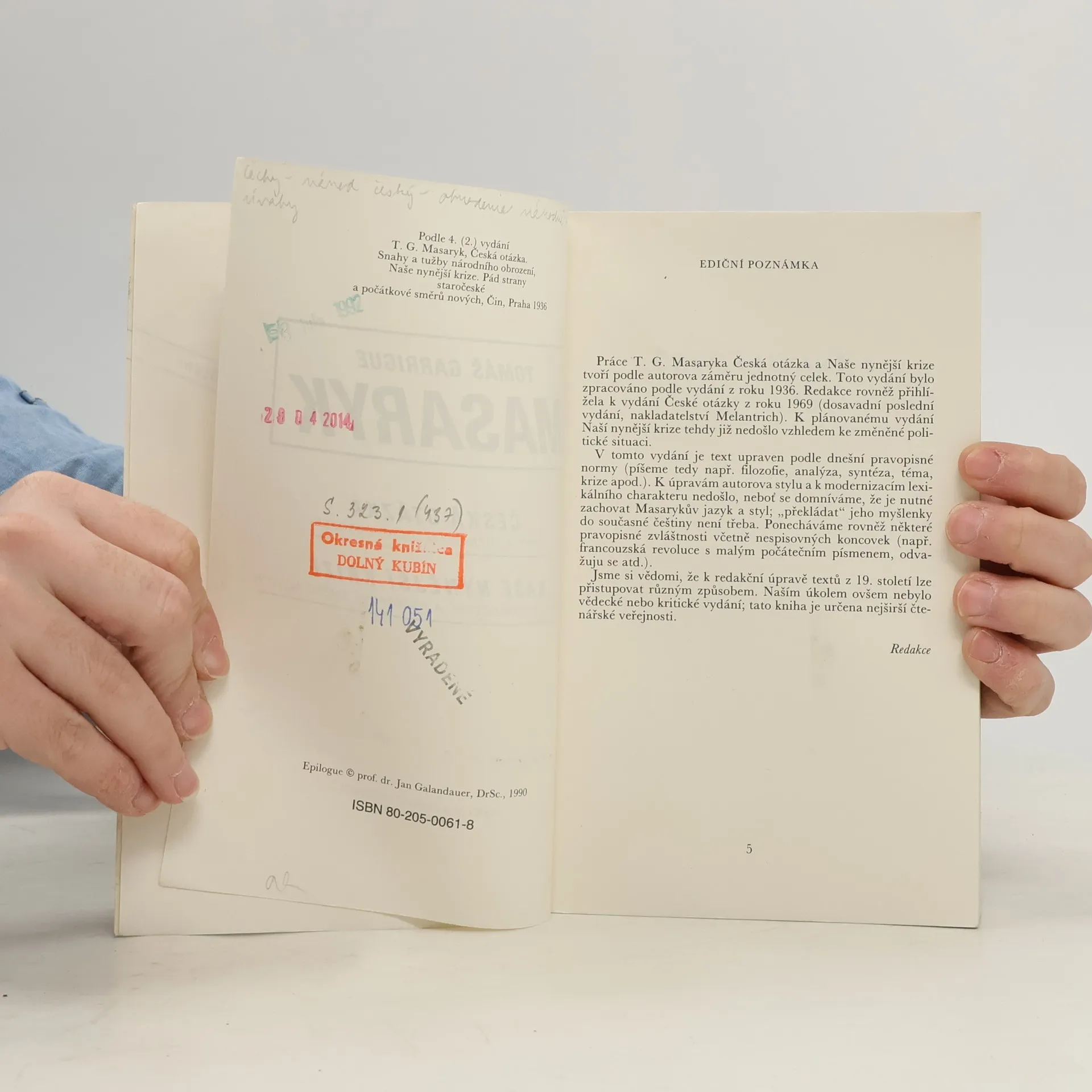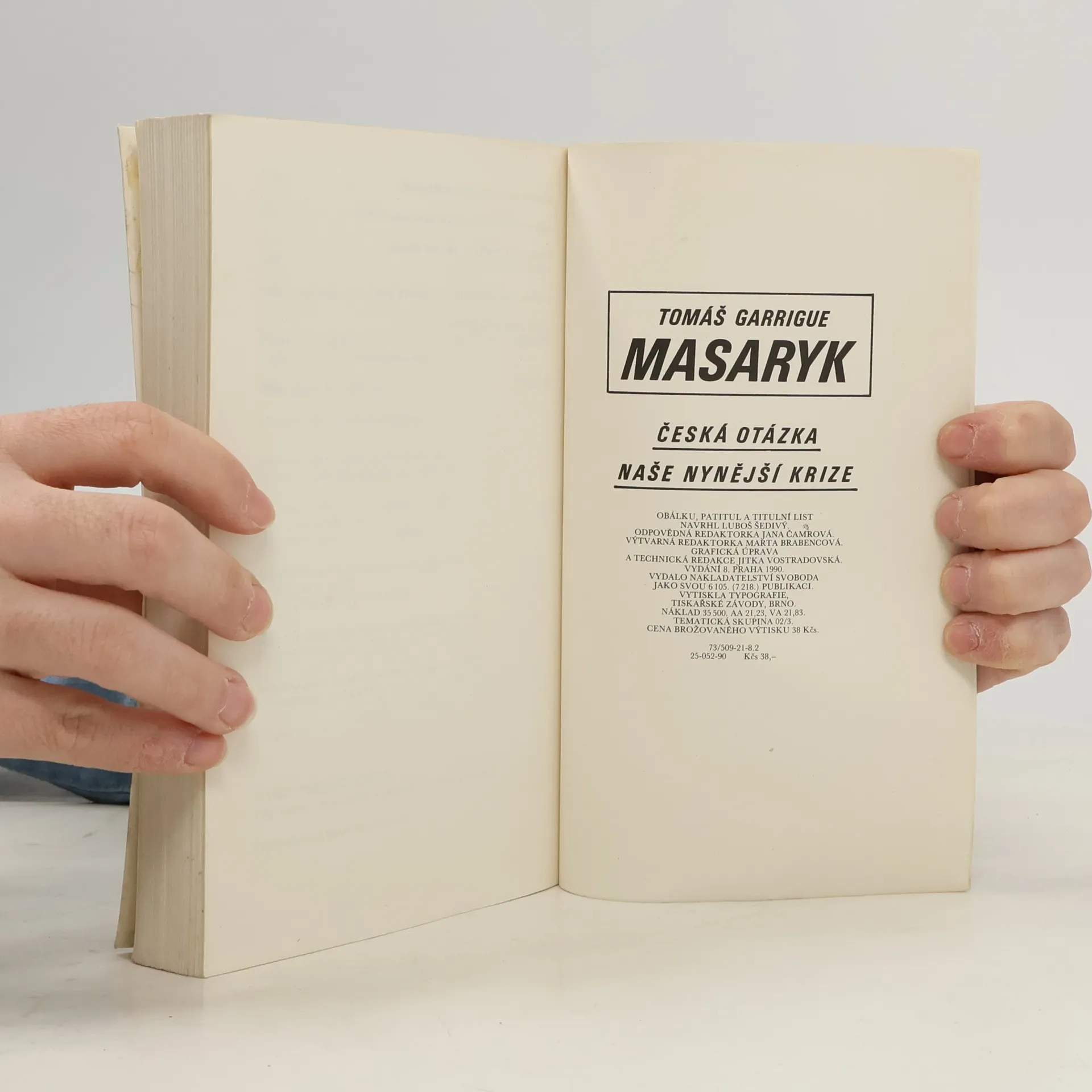 Česká otázka: Snahy a tužby národního obrození ; Naše nynější krize: pád strany staročeské a počátkové směrů nových. Pokus o zformulování filosofie českých národních dějin. Program, který vychází ze syntézy tradic české reformace, národního obrození a obecných humanitních zásad. Doslov: Jan Galandauer: Naše nynější krize: Pád strany staročeské a počátkové směrů nových. 25-052-90