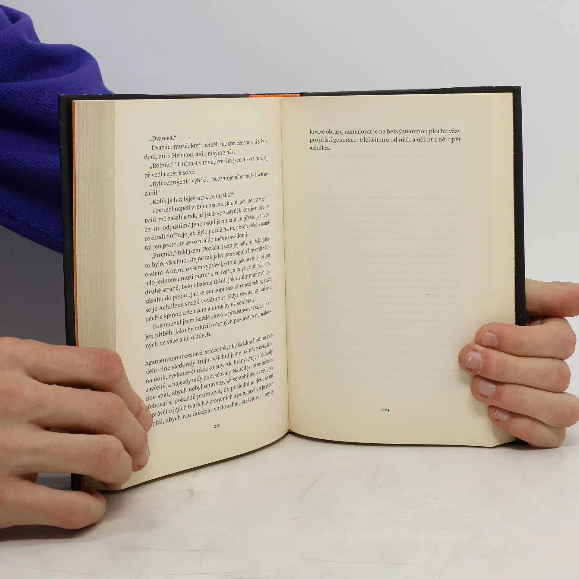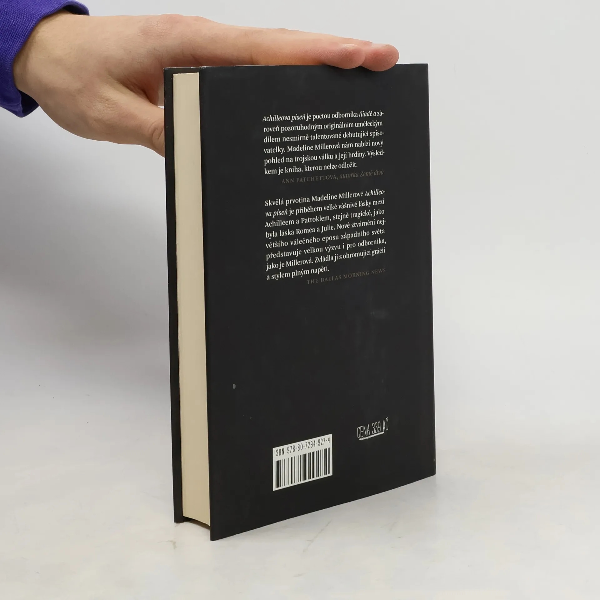 Řecko v časech hrdinů. Patroklos, nešikovný mladý princ, byl vyhoštěn do království Fthie, kde žije přehlížen ve stínu krále Pelea a jeho zlatovlasého syna Achillea. Achilleus, „nejlepší ze všech Řeků“, je vším, čím Patroklos není – silný, krásný, syn bohyně –, a jejich cesty se nikdy neměly zkřížit. Jednoho dne ho však Achilleus vezme pod svou ochranu a brzy se z nich stanou přátelé. Vzdělávají se v umění války a medicíny a z jejich pouta vznikne něco mnohem hlubšího – k nelibosti Achilleovy matky Thetidy, kruté mořské nymfy. Když přijde zpráva, že byla unesena Helena Spartská, jsou řečtí muži vyzváni, aby šli do války proti Troji. Achilleus se připojí, sveden příslibem slavného osudu. Patroklos, zmítaný láskou a strachem o svého přítele, následuje Achillea do války, aniž tuší, jak krutá zkouška je čeká. Toto dojemné a originální ztvárnění trojské války je zničujícím příběhem lásky a soupeření mezi bohy a lidmi. Hlavní zápas se však odehrává mezi nelítostnou ctižádostí a touhou lidského srdce po míru. První vydání.