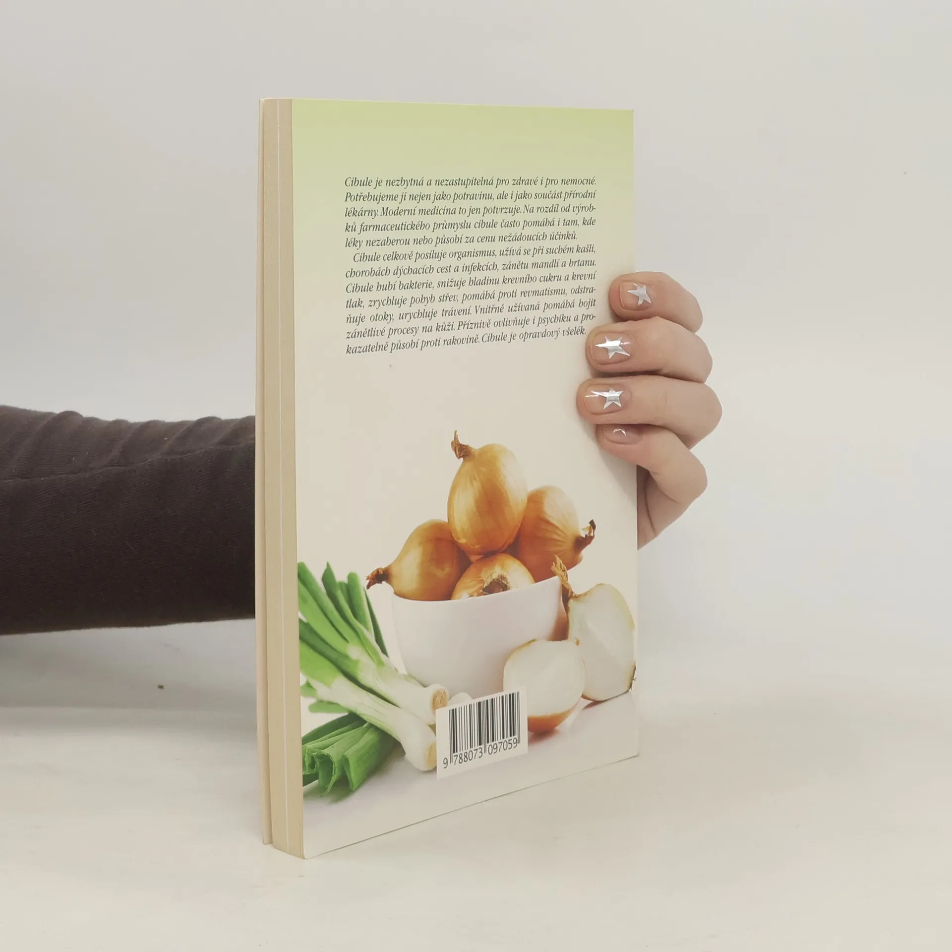 Cibule je nazbytná a nezastupitelná pro zdravé i nemocné. Potřebujeme ji nejen jako potravinu, ale i jako součást přírodní lékárny. Moderní medicína to jen potvrzuje. Na rozdíl od výrobků farmaceutického průmyslu cibule často pomáhá i tam, kde léky nezaberou nebo působí za cenu nežádoucích vedlejších účinků. Cibule celkově psiluje organismus, užívá se při suchém kašli, chorobách dýchacích cest a infekcích, zánětu mandlí a hrtanu. Cibule hubí bakterie, snižuje hladinu krevního cukru a krevní tlak, zrychluje pohyb střev, pomáhá proti revmatismu, odstraňuje otoky, urychluje trávení. Cibule je opravdový všelék. Pojednání o cibuli doplňuje množství receptů.