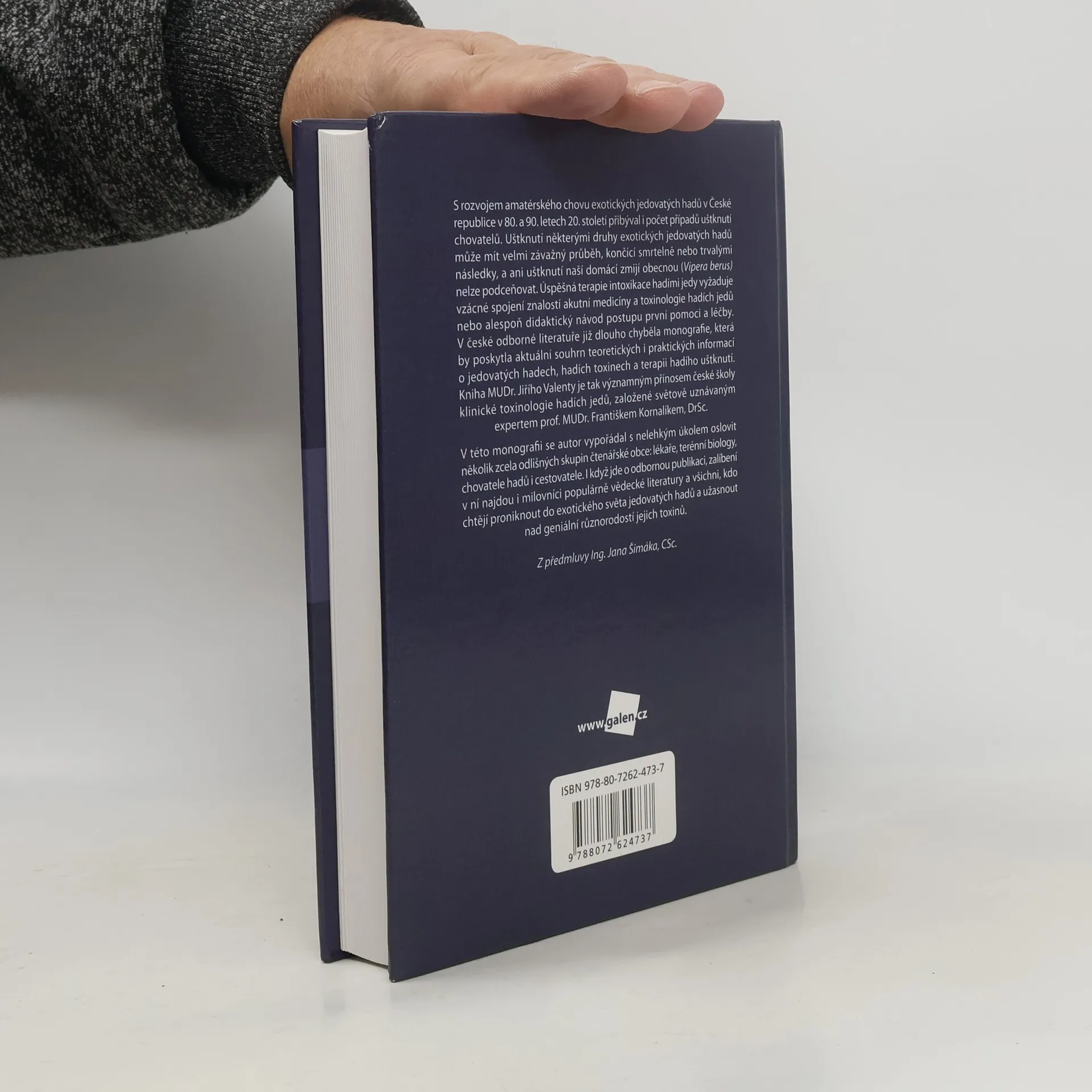 S rozvojem amatérského chovu exotických jedovatých hadů v České republice v 80. a 90. letech 20. století přibýval i počet případů uštknutí chovatelů. Uštknutí některými druhy exotických jedovatých hadů může mít velmi závažný průběh, končící smrtelně nebo trvalými následky, a ani uštknutí naší domácí zmijí obecnou (Vipera berus) nelze podceňovat. Úspěšná terapie intoxikace hadími jedy vyžaduje vzácné spojení znalostí akutní medicíny a toxinologie hadích jedů, nebo alespoň didaktický návod postupu první pomoci a léčby. V české odborné literatuře již dlouho chyběla monografie, která by poskytla aktuální souhrn teoretických i praktických informací o jedovatých hadech, hadích toxinech a terapii hadího uštknutí. Kniha MUDr. Jiřího Valenty je tak významným přínosem české školy klinické toxinologie hadích jedů, založené světově uznávaným expertem prof. MUDr. Františkem Kornalíkem, DrSc. V této monografii se autor vypořádal s nelehkým úkolem oslovit několik zcela odlišných skupin čtenářské obce: lékaře, terénní biology, chovatele hadů i cestovatele. I když jde o odbornou publikaci, zalíbení v ní najdou i milovníci populárně vědecké literatury a všichni, kdo chtějí proniknout do exotického světa jedovatých hadů a užasnout nad geniální různorodostí jejich toxinů.