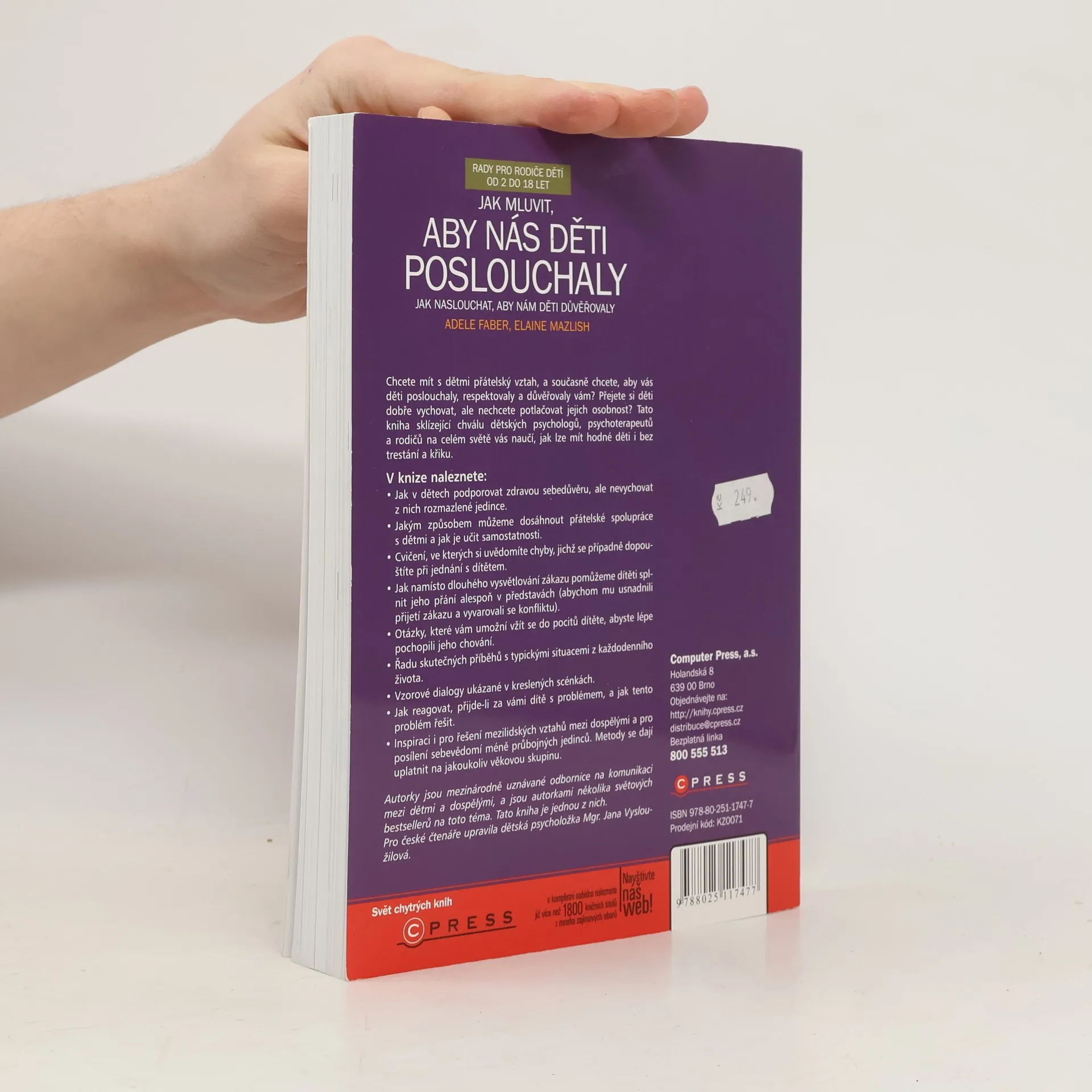 S podtitulem: Jak naslouchat, aby nám děti důvěřovaly. Chcete mít s dětmi přátelský vztah, a současně chcete, aby vás děti poslouchaly, respektovaly a důvěřovaly vám? Přejete si děti dobře vychovat, ale nechcete potlačovat jejich osobnost? Tato kniha sklízející chválu dětských psychologů, psychoterapeutů a rodičů na celém světě vás naučí, jak lze mít hodné děti i bez trestání a křiku. V knize naleznete: • Jak v dětech podporovat zdravou sebedůvěru, ale nevychovat z nich rozmazlené jedince. • Jakým způsobem můžeme dosáhnout přátelské spolupráce s dětmi a jak je učit samostatnosti. • Cvičení, ve kterých si uvědomíte chyby, jichž se případně dopouštíte při jednání s dítětem. • Jak namísto dlouhého vysvětlování zákazu pomůžeme dítěti splnit jeho přání alespoň v představách (abychom mu usnadnili přijetí zákazu a vyvarovali se konfliktu). • Otázky, které vám umožní vžít se do pocitů dítěte, abyste lépe pochopili jeho chování. • Řadu skutečných příběhů s typickými situacemi z každodenního života. • Vzorové dialogy ukázané v kreslených scénkách • Jak reagovat, přijde-li za vámi dítě s problémem, a jak tento problém řešit. • Inspiraci i pro řešení mezilidských vztahů mezi dospělými a pro posílení sebevědomí méně průbojných jedinců. Metody se dají uplatnit na jakoukoliv věkovou skupinu.