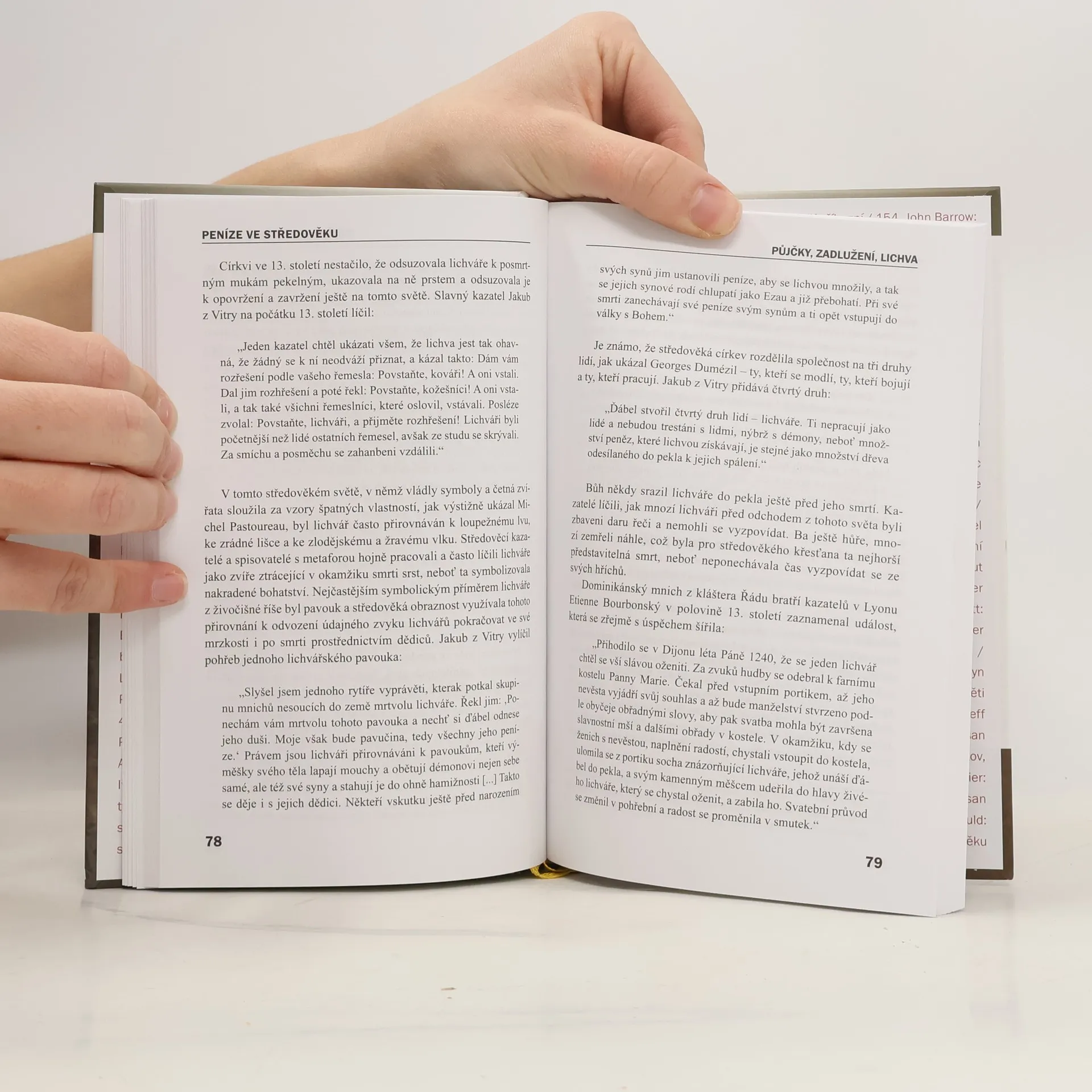 Historicko-antropologická studie Celosvětově uznávaný medievalista Jacques Le Goff se ve své nové publikaci zaměřuje na úlohu a postavení peněz ve středověkém životě, ekonomice a mentalitě. V tehdejší náboženstvím ovládané společnosti to byla církev, kdo zkoumal a určoval postoj, jaký má křesťan k penězům zaujmout. Ačkoli peníze hrály významnou úlohu v rozmachu měst a obchodu a v utváření států, středověk ani na svém sklonku při neexistenci skutečného globálního trhu nezažil kapitalismus, byť i jen v zárodečném stadiu. Proto byl ekonomický rozvoj ve středověku navzdory několika pozoruhodným výsledkům pomalý a omezený. Dávat peníze bylo tehdy stejně důležité, jako je získávat. Skutečné bohatství dosud nebylo pozemské, třebaže úloha peněz v myslích a skutcích lidí nabývala na významu. Le Goffova čtivá studie oslovuje profesionální historiky i širokou veřejnost a uvádí na pravou míru četná názorová klišé.