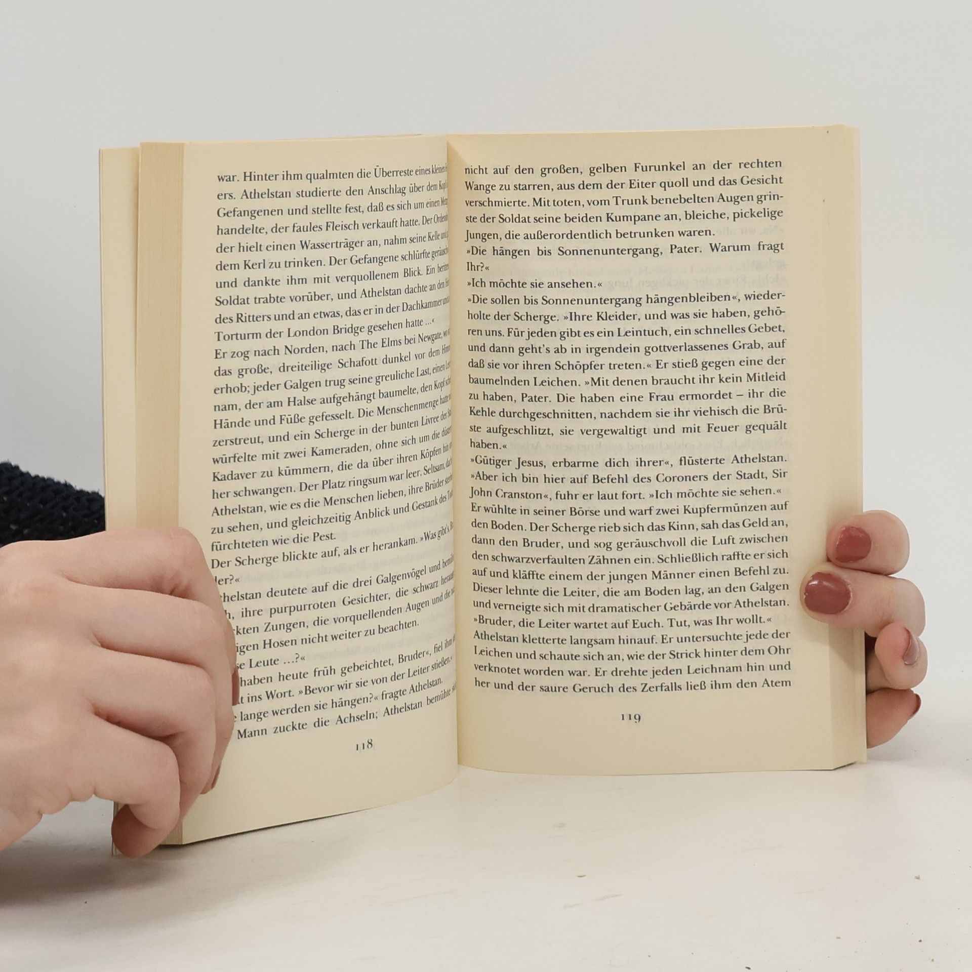London im Jahre 1377: Als ein reicher Kaufmann tot in seinem Schlafzimmer aufgefunden wird, muss natürlich der Coroner den merkwürdigen Todesumständen auf den Grund gehen. Cranston, der dauernd betrunken ist, wirkt auf den ersten Blick dumm und leicht zu übertölpeln, doch in Wahrheit ist sein Verstand so scharf wie sein Schwert. Zusammen mit dem ihm zugeteilten Sekretär Bruder Athelstan begibt er sich auf die Suche nach des Rätsels Lösung …