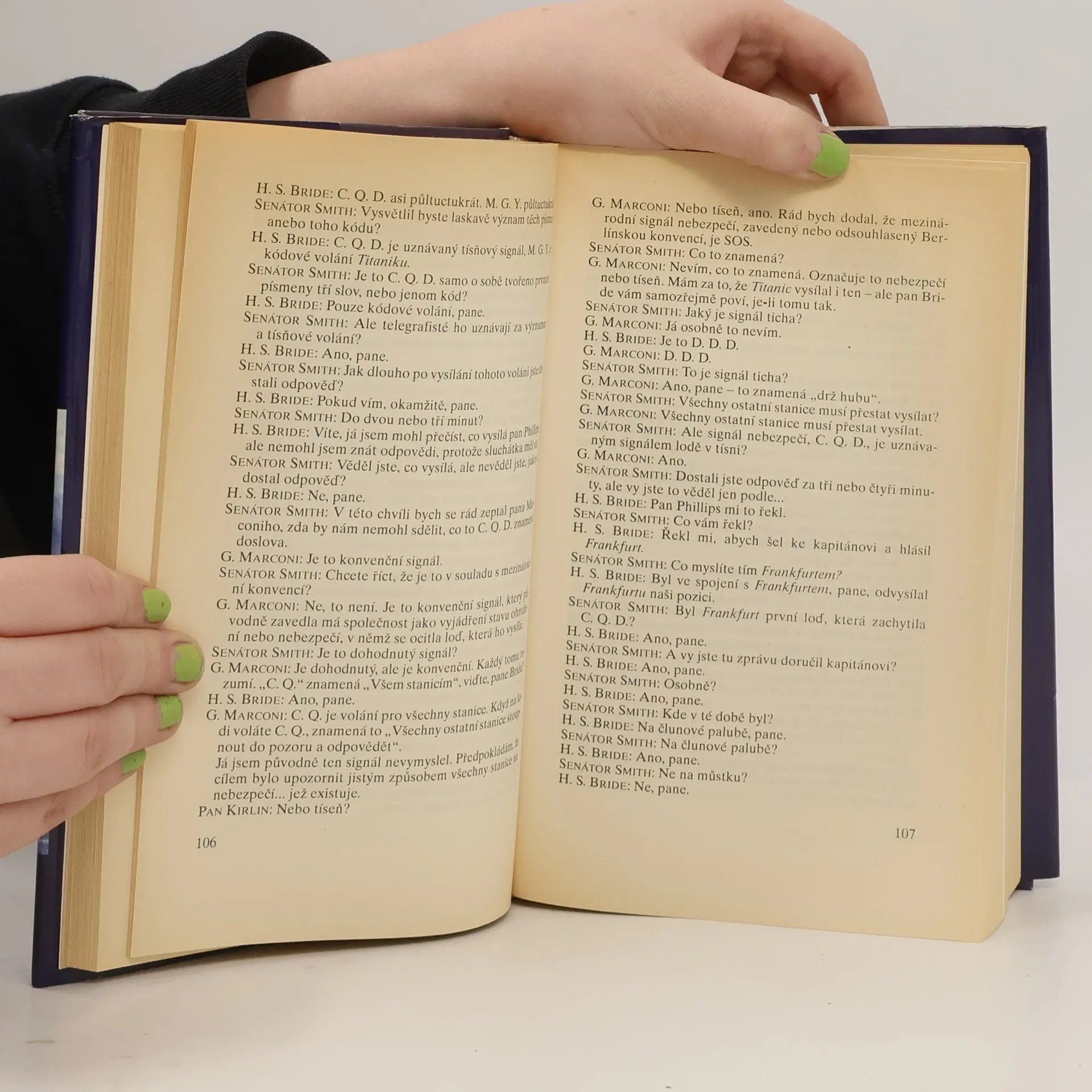 Kniha je přepisem výpovědí při vyšetřování Senátem z roku 1912. Jsou zde výpovědi: J. Bruce Ismaye, provozního ředitele White Star Line, Arthura Henryho Rostrona, kapitána Carpathie, Charlese Lightollera, II. důstojníka Titaniku a dalších, jež nešťastnou událost přežili.