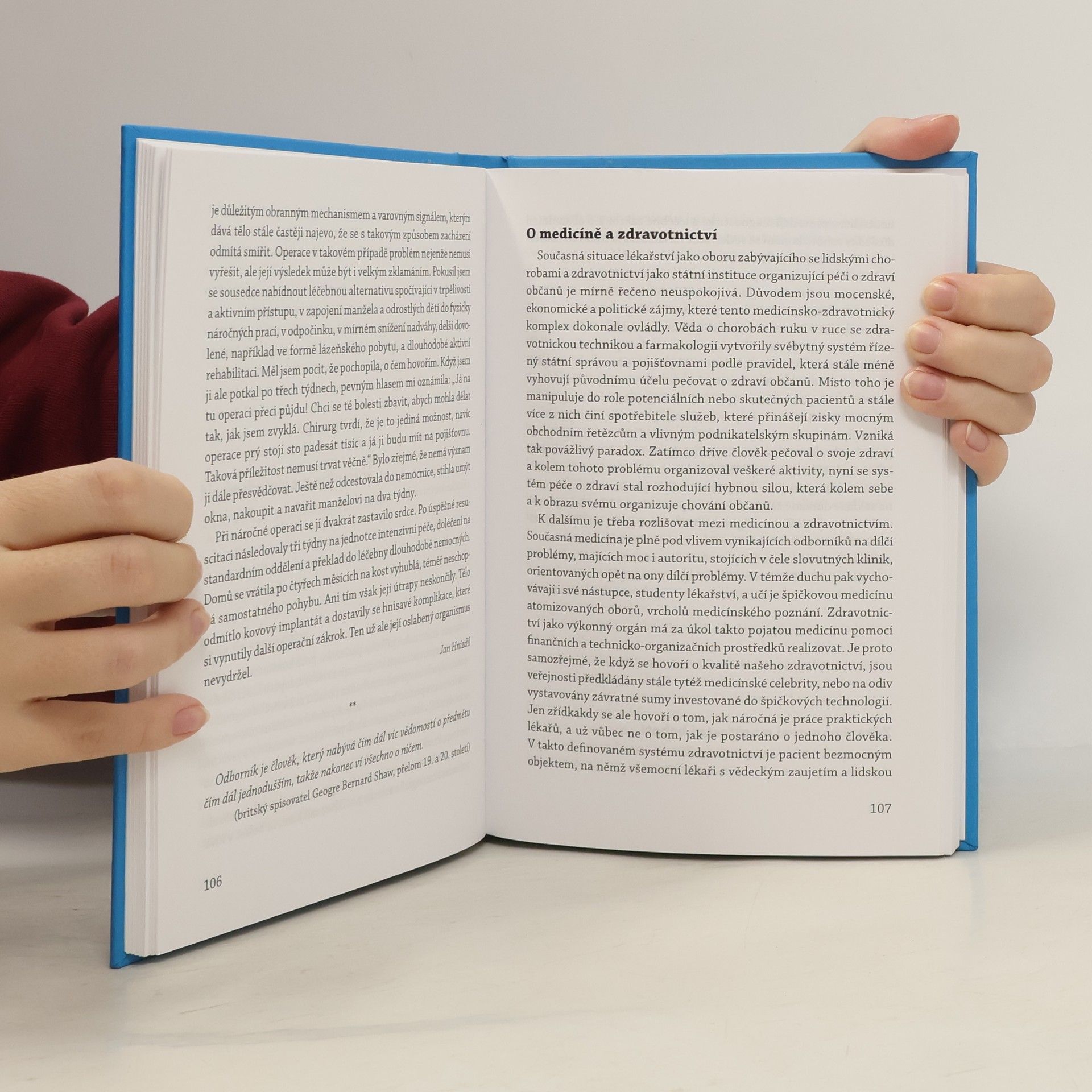 aneb Hippokratova noční můra Současná situace lékařství jako oboru zabývajícího se lidskými chorobami a zdravotnictví jako státní instituce organizující péči o zdraví občanů, je mírně řečeno neuspokojivá. Důvodem jsou mocenské, ekonomické a politické zájmy, které tento medicínsko-zdravotnický komplex dokonale ovládly. Věda o chorobách ruku v ruce se zdravotnickou technikou a farmakologií vytvořily svébytný systém řízený státní správou a pojišťovnami podle pravidel, které stále méně vyhovují původnímu účelu pečovat o zdraví občanů. Místo toho je manipuluje do role potenciálních nebo skutečných pacientů a stále více z nich činí spotřebitele služeb, které přinášejí zisky mocným obchodním řetězcům a vlivným podnikatelským skupinám. Vzniká tak povážlivý paradox. Zatímco dříve člověk pečoval o svoje zdraví a kolem tohoto problému organizoval veškeré aktivity, nyní se systém péče o zdraví stal rozhodující hybnou silou, která kolem sebe a k obrazu svému organizuje chování občanů. Tato skutečnost je vůdčí ideou knihy příběhů a esejů, které se týkají každého, kdo překročil práh nějakého zdravotnického zařízení.