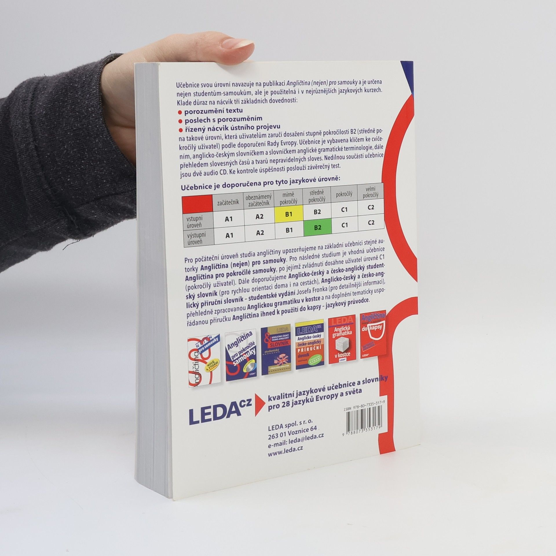 Učebnice svou úrovní navazuje na publikaci Angličtina (nejen) pro samouky a je určena nejen studentům-samoukům, ale je použitelná i v nejrůznějších jazykových kurzech. Klade důraz na nácvik tří základních dovedností: • porozumění textu • poslech s porozuměním • řízený nácvik ústního projevu na takové úrovni, která uživatelům zaručí dosažení stupně pokročilosti B2 (středně pokročilý uživatel) podle doporučení Rady Evropy. Učebnice je vybavena klíčem ke cvičením, anglicko-českým slovníčkem a slovníčkem anglické gramatické terminologie, dále přehledem slovesných časů a tvarů nepravidelných sloves. Ke kontrole úspěšnosti poslouží závěrečný test.