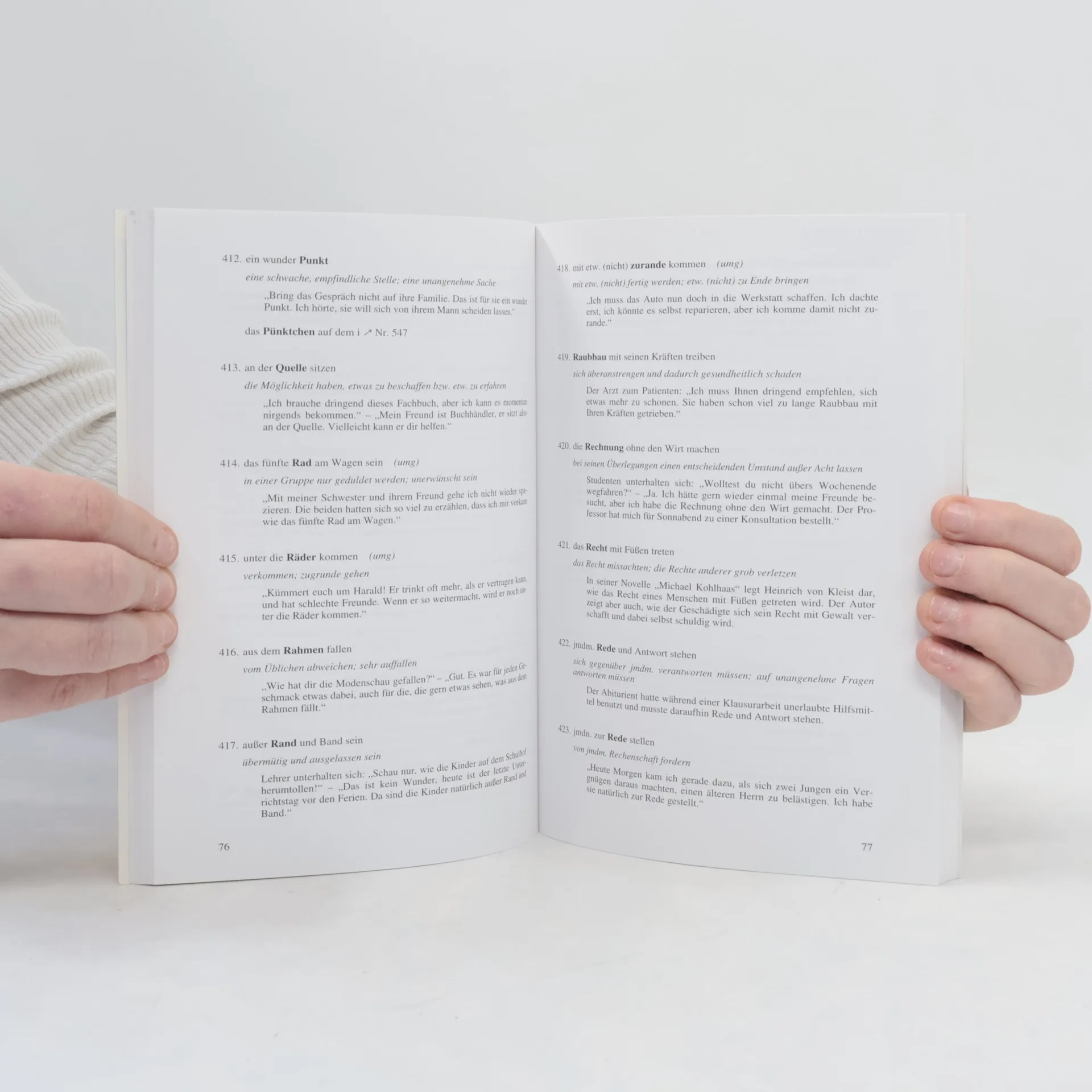 Eine Auswahl von 600 sprichwörtlichen Redensarten, die in der Alltagssprache eine wichtige Rolle spielen. Eine Erläuterung des Begriffsinhalts, die Kennzeichnung der entsprechenden Stilschicht sowie ein Textbeispiel sind zugeordnet.