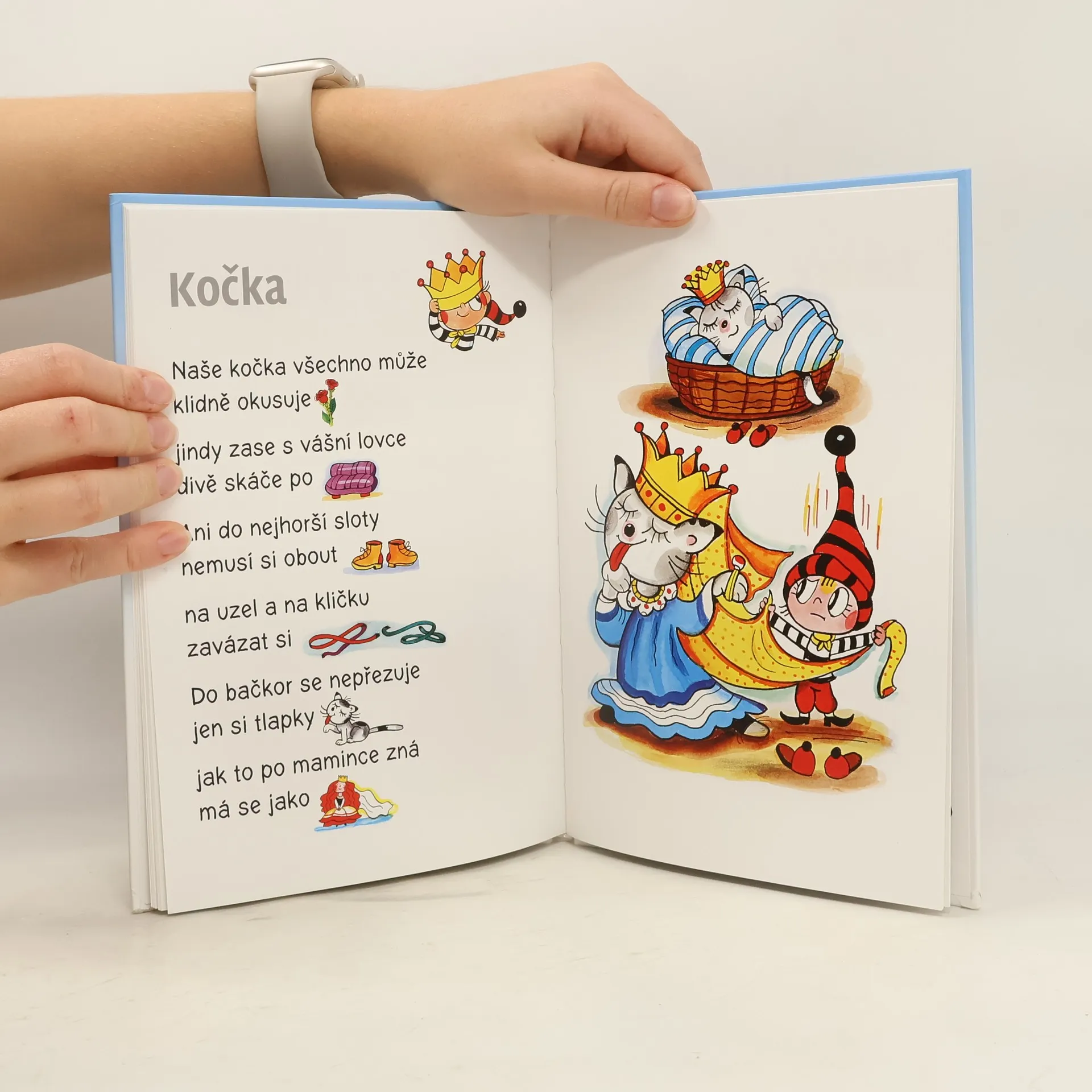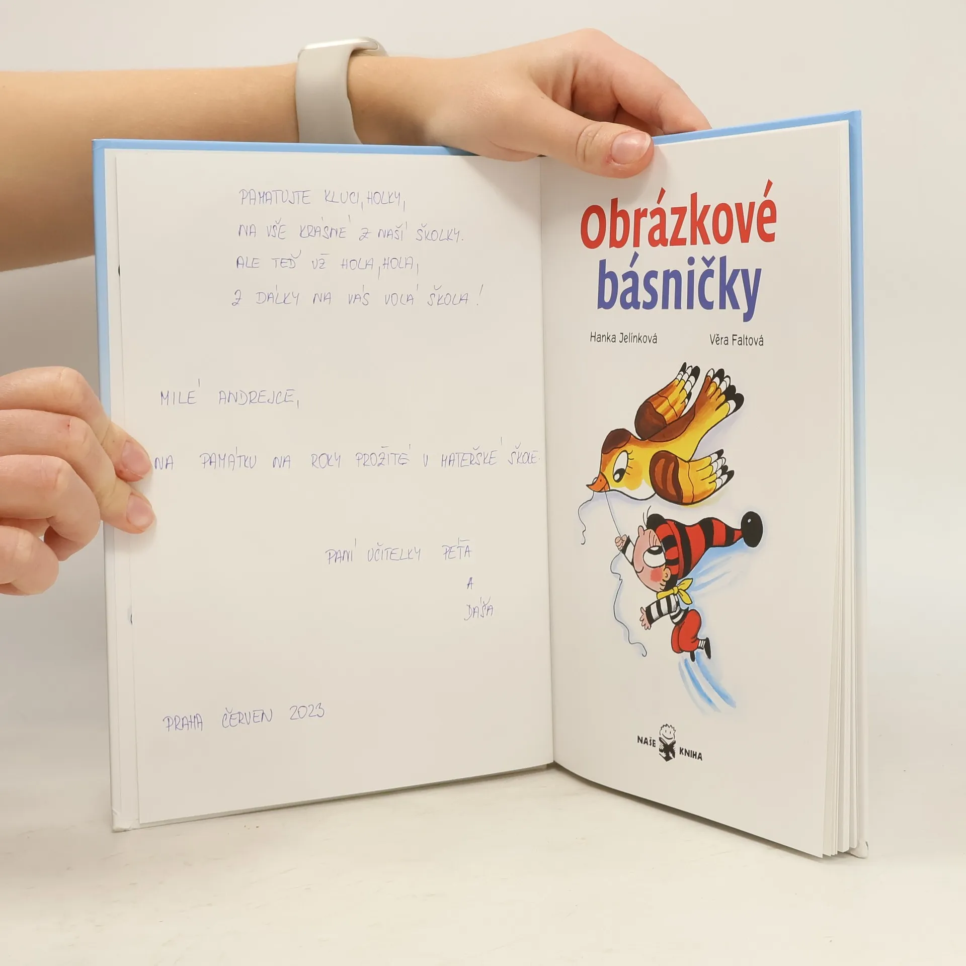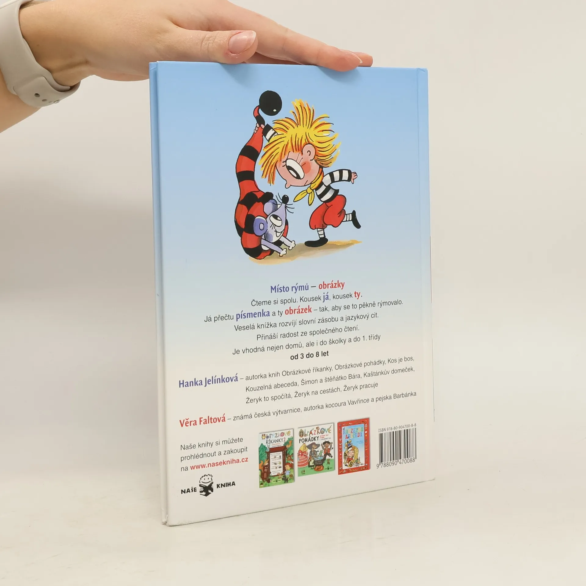 Místo rýmu – obrázky. Čteme si spolu. Kousek já, kousek ty. Já přečtu písmenka a ty obrázek – tak, aby se to pěkně rýmovalo.Veselá knížka rozvíjí slovní zásobu a jazykový cit. Přináší radost ze společného čtení. Je vhodná nejen domů, ale i do školky a do 1. třídy od 3 do 8 let Hanka Jelínková – autorka oblíbených Obrázkových říkanek, Kouzelné abecedy, knížky Šimon a štěňátko Bára, učitelka a překladatelka. Věra Faltová – známá česká výtvarnice, autorka kocoura Vavřince a pejska Barbánka