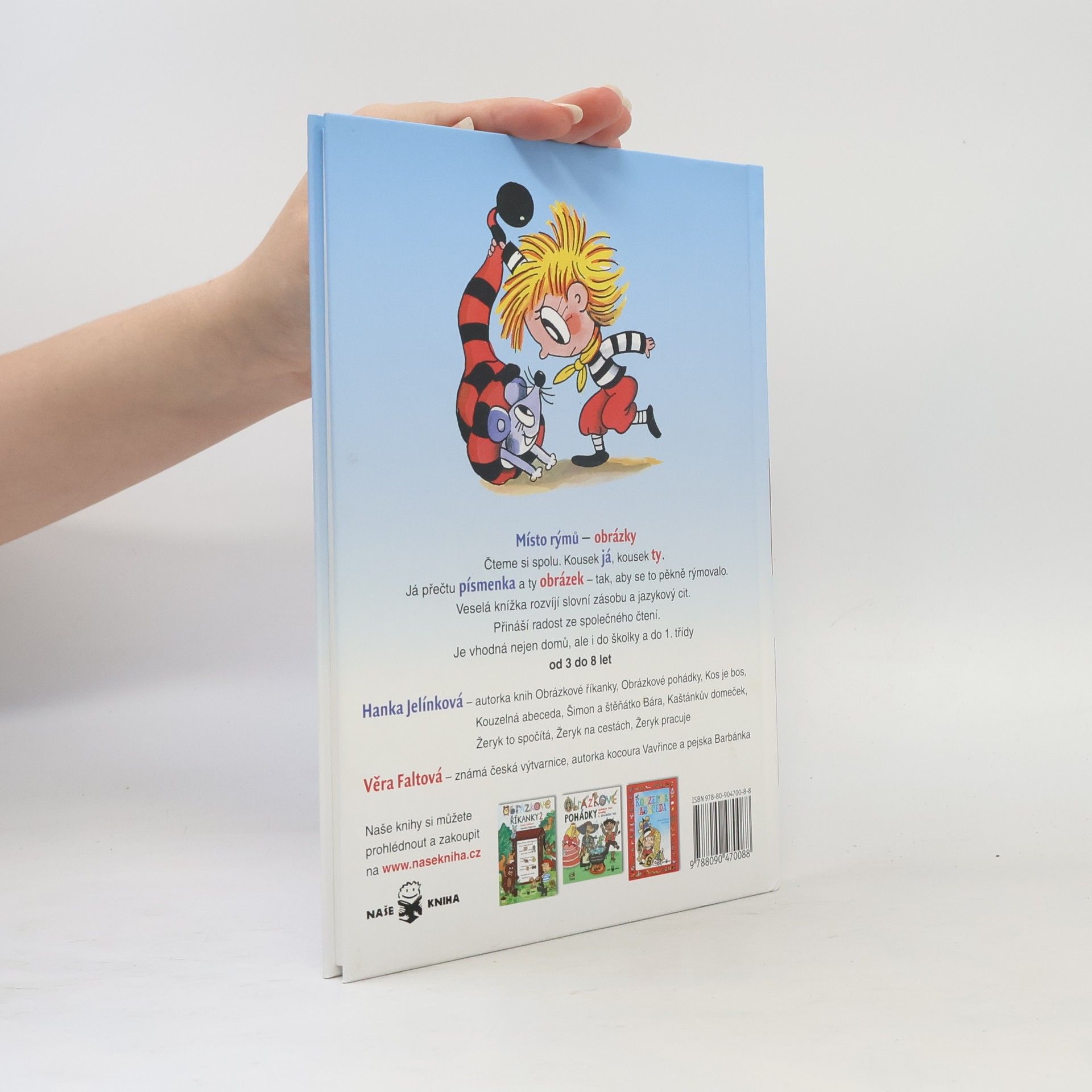 Místo rýmu – obrázky. Čteme si spolu. Kousek já, kousek ty. Já přečtu písmenka a ty obrázek – tak, aby se to pěkně rýmovalo.Veselá knížka rozvíjí slovní zásobu a jazykový cit. Přináší radost ze společného čtení. Je vhodná nejen domů, ale i do školky a do 1. třídy od 3 do 8 let Hanka Jelínková – autorka oblíbených Obrázkových říkanek, Kouzelné abecedy, knížky Šimon a štěňátko Bára, učitelka a překladatelka. Věra Faltová – známá česká výtvarnice, autorka kocoura Vavřince a pejska Barbánka