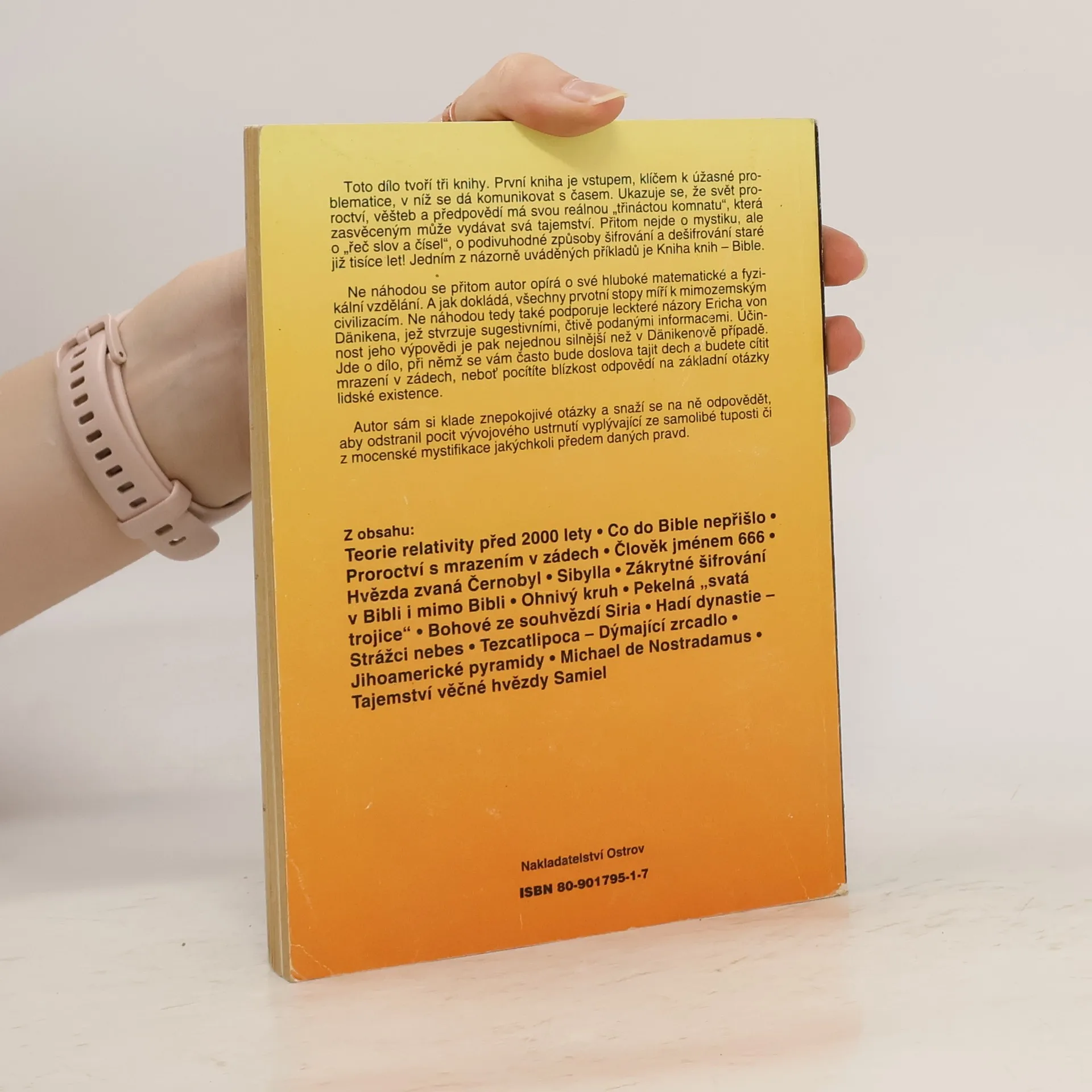 Kniha obsahuje: Co do Bible nepřišlo, Proroctví s mrazením v zádech,Člověk jménem 666, Hvězda zvaná Černobyl, Sibylla,Zakryté šifrování v Bibli i mimo Bibli,Ohnivý kruh,Michael de Nostradamus apod.
