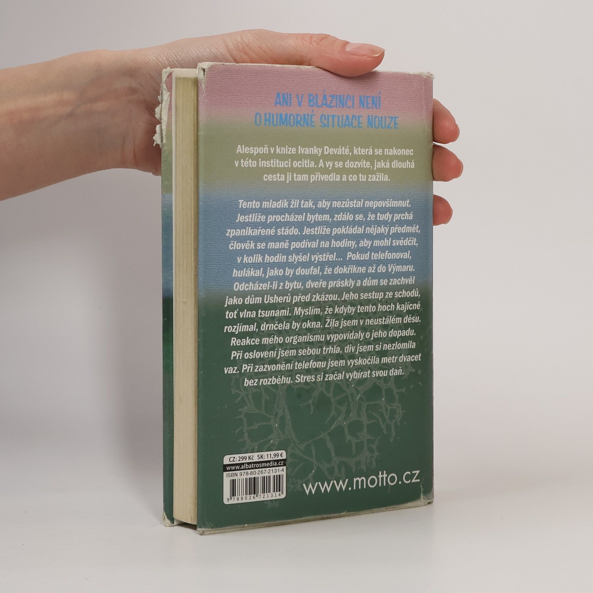 Ani v blázinci není o humorné situace nouze Alespoň v knize Ivanky Deváté, která se nakonec v této instituci ocitla. A vy se dozvíte, jaká dlouhá cesta ji přivedla a co tam zažila. Tento mladík žil tak, aby nezůstal nepovšimnut. Jestliže procházel bytem, zdálo se, že tudy prchá zpanikařené stádo. Jestliže pokládal nějaký předmět, člověk se maně podíval na hodiny, aby mohl svědčit, v kolik hodin slyšel výstřel… Pokud telefonoval, hulákal, jako by doufal, že dokřikne až do Výmaru. Odcházel-li z bytu, dveře práskly a dům se zachvěl jako dům Usherů před zkázou. Jeho sestup ze schodů, toť vlna tsunami. Myslím, že kdyby tento hoch kajícně rozjímal, drnčela by okna. Žila jsem v neustálém děsu. Reakce mého organismu vypovídaly o jeho dopadu. Při oslovení jsem sebou trhla, div jsem si nezlomila vaz. Při zazvonění telefonu jsem vyskočila metr dvacet bez rozběhu. Stres si začal vybírat svou daň.