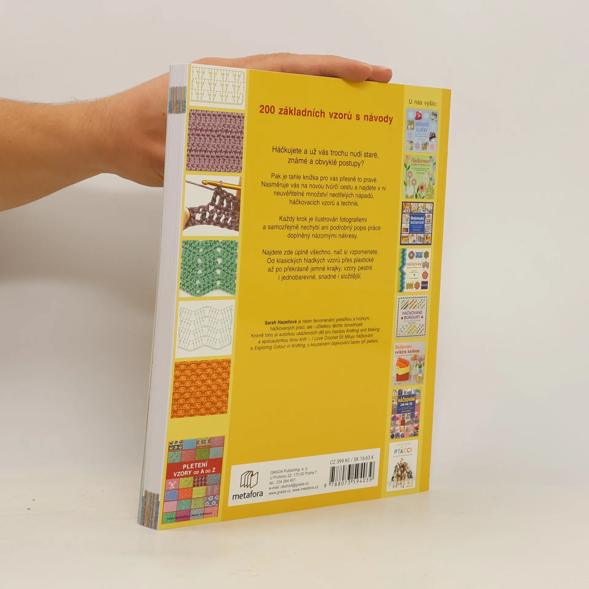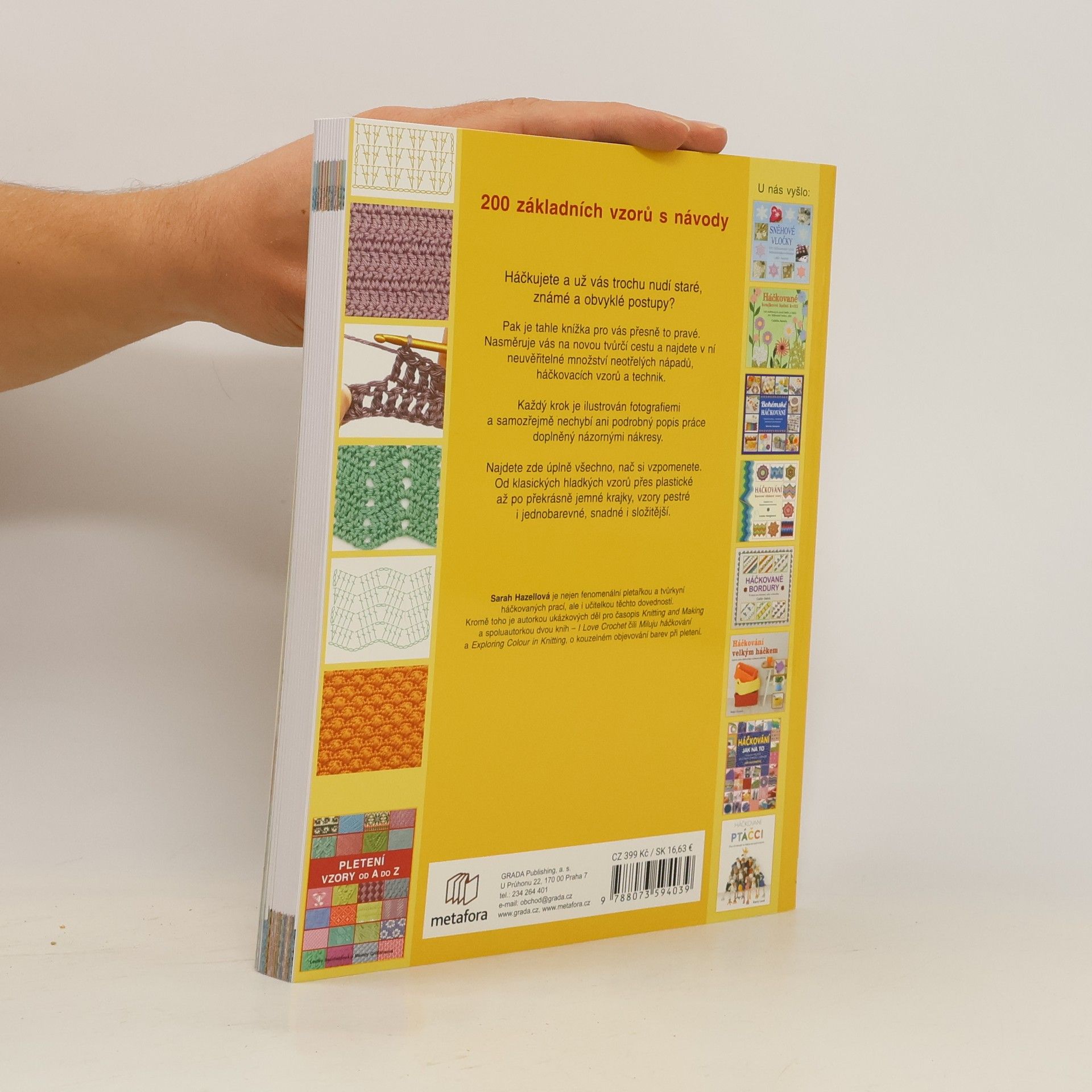 200 základních vzorů s návody Postupy, vzory, nové nápadité techniky - encyklopedie háčkování pro začátečníky i pokročilé. Háčkujete, a už vás trochu nudí staré, známé a obvyklé postupy? Pak je tahle knížka pro vás přesně to pravé. Nasměruje vás na novou tvůrčí cestu a najdete v ní neuvěřitelné množství neotřelých nápadů, háčkovacích vzorů a technik. Každý krok je ilustrován fotografiemi a samozřejmě nechybí ani podrobný popis práce doplněný názornými nákresy. Najdete zde úplně všechno, nač si vzpomenete. Od klasických hladkých vzorů přes plastické až po překrásné jemné krajky, vzory pestré i jednobarevné, snadné i složitější. Sarah Hazellová je nejen fenomenální pletařkou a tvůrkyní háčkovaných prací, ale i učitelkou těchto dovedností.