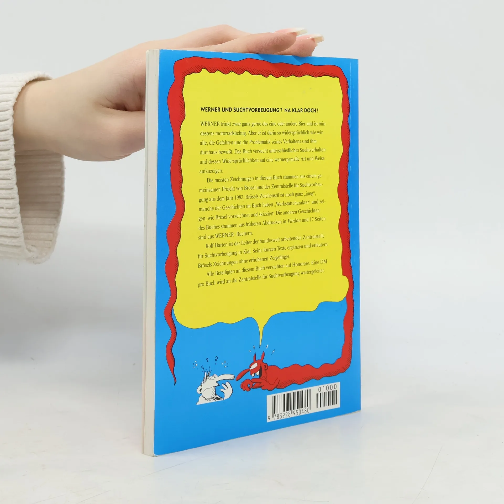 Rückentext:WERNER UND SUCHVORBEUGUNG? NA KLAR DOCH!Werner trinkt zwar gerne das eine oder andere Bier und ist mindestens motorradsüchtig. Aber er ist darin so widersprüchlich wie wir alle, die Gefahren und die Problematik seines Verhaltens sind ihm durchaus bewußt. Das Buch versucht unterschiedliches Suchtverhalten und dessen Widersprüchlichkeit auf eine wernergemäße Art und Weise aufzuzeigen.Die meisten Zeichnungen in diesem Buch stammen aus einem gemeinsamen Projekt von Brösel und der Zentralstelle für Suchtvorbeugung aus dem Jahr 1982. Brösels Zeichenstil ist noch ganz „jung“, manche der Geschichten im Buch haben „Werkstattcharakter“ und zeigen, wie Brösel vorzeichnet und skizziert. Die anderen Geschichten des Buches stammen aus früheren Abdrucken in „Pardon“ und 17 Seiten sind aus WERNER-Büchern.Rolf Harten ist Leiter der bundesweit arbeitenden Zentralstelle für Suchtvorbeugung in Kiel. Seine kurzen Texte ergänzen und erläutern Brösels Zeichnungen ohne erhobenen Zeigefinger.Alle Beteiligten an diesem Buch verzichten auf Honorare. Eine DM pro Buch wird an die Zentralstelle für Suchtvorbeugung weitergeleitet.