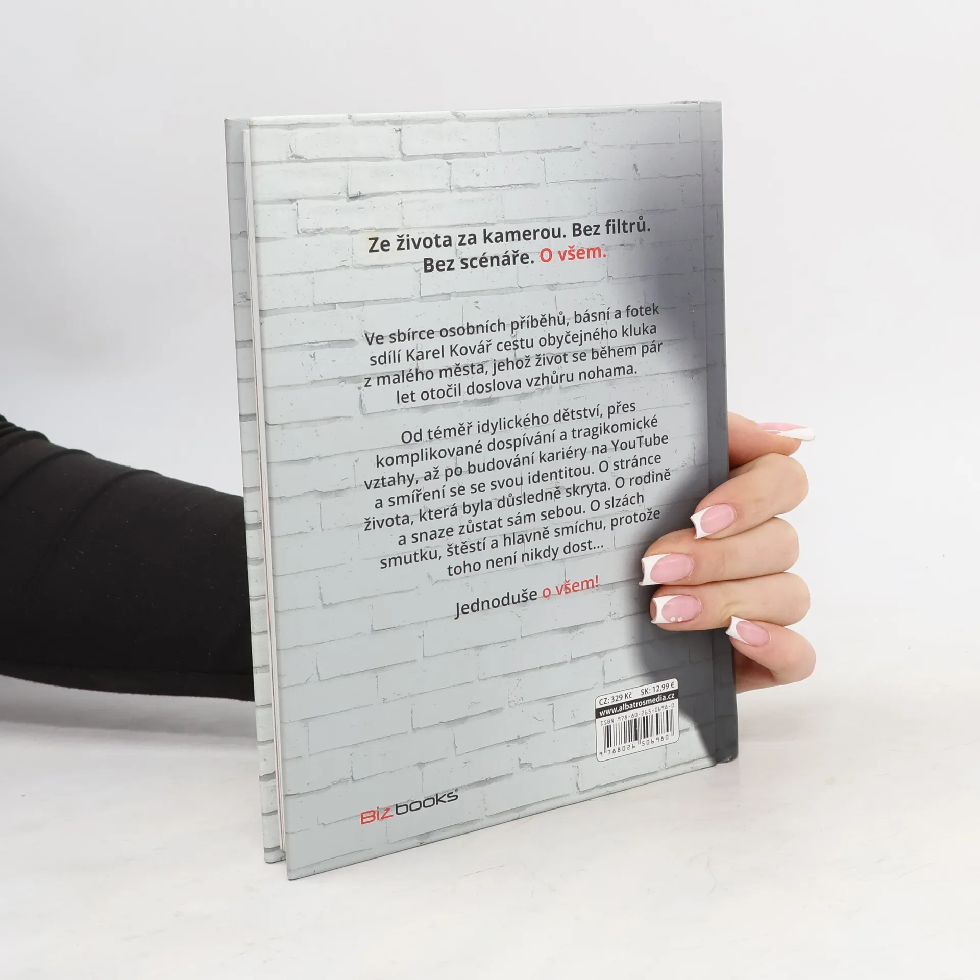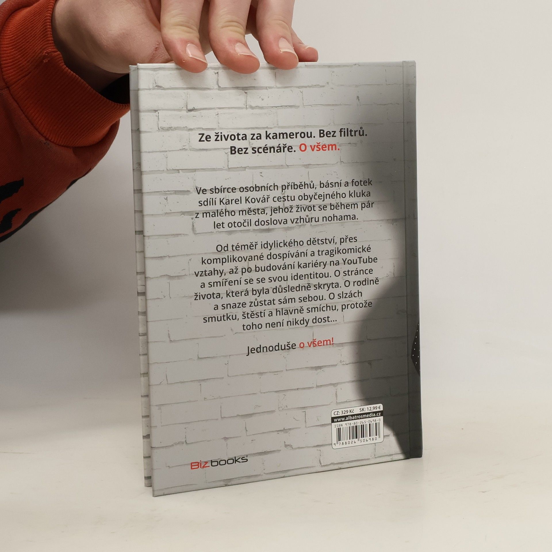 Bez filtrů. Bez scénáře. O všem. Ve sbírce osobních příběhů, básní a fotek sdílí Karel Kovář cestu obyčejného kluka z malého města, jehož život se během pár let otočil doslova vzhůru nohama. Od téměř idylického dětství, přes komplikované dospívání a tragikomické vztahy, až po budování kariéry na YouTube a smíření se se svou identitou. O stránce života, která byla důsledně skryta. O rodině a snaze zůstat sám sebou. O slzách smutku, štěstí a hlavně smíchu, protože toho není nikdy dost–… Jednoduše o všem!