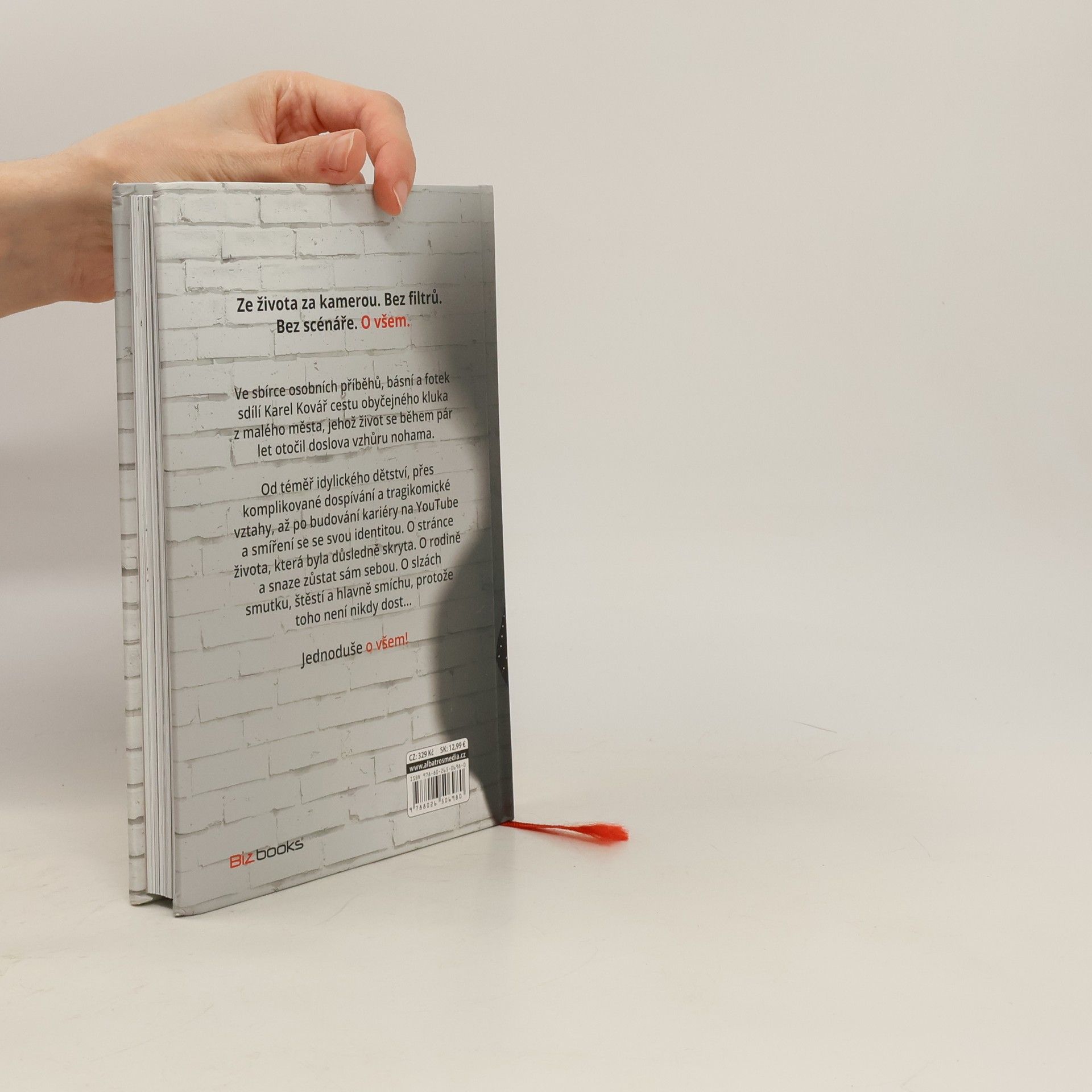 Bez filtrů. Bez scénáře. O všem. Ve sbírce osobních příběhů, básní a fotek sdílí Karel Kovář cestu obyčejného kluka z malého města, jehož život se během pár let otočil doslova vzhůru nohama. Od téměř idylického dětství, přes komplikované dospívání a tragikomické vztahy, až po budování kariéry na YouTube a smíření se se svou identitou. O stránce života, která byla důsledně skryta. O rodině a snaze zůstat sám sebou. O slzách smutku, štěstí a hlavně smíchu, protože toho není nikdy dost–… Jednoduše o všem!
