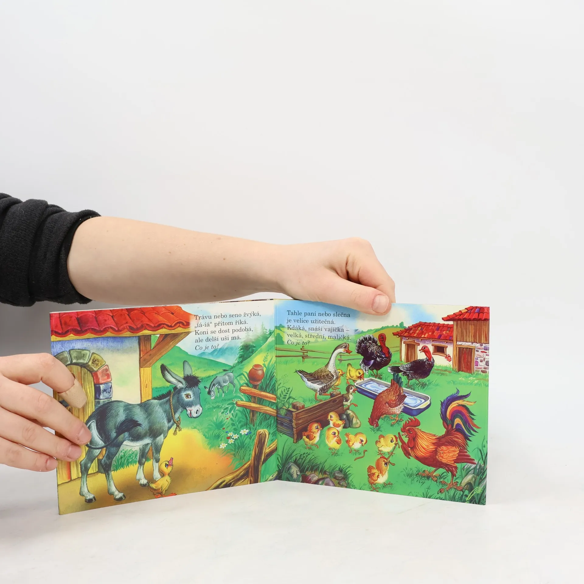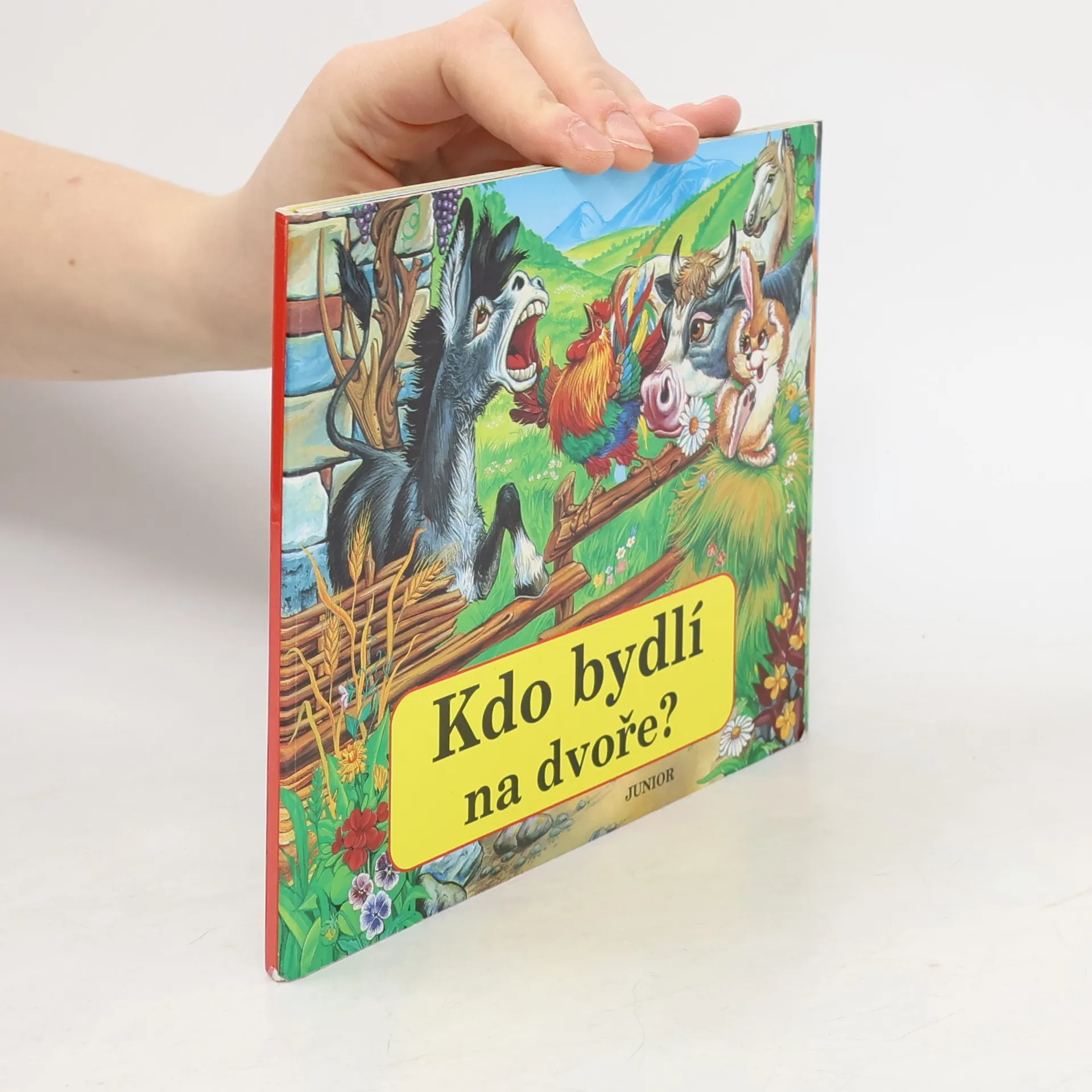 Leporelo Kdo bydlí na dvoře? seznámí nejmenší čtenáře se životem deseti zvířátek na dvorku. Na každé stránce čeká děti kromě názorných obrázků veršovaná hádanka.